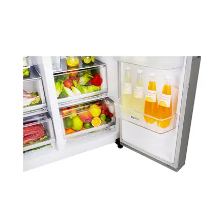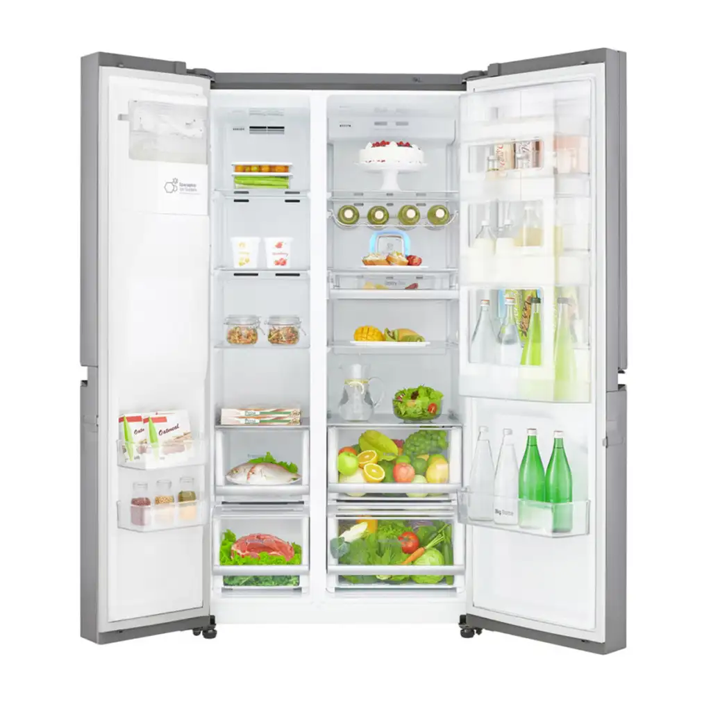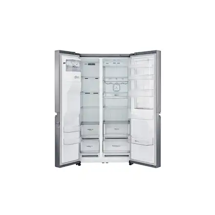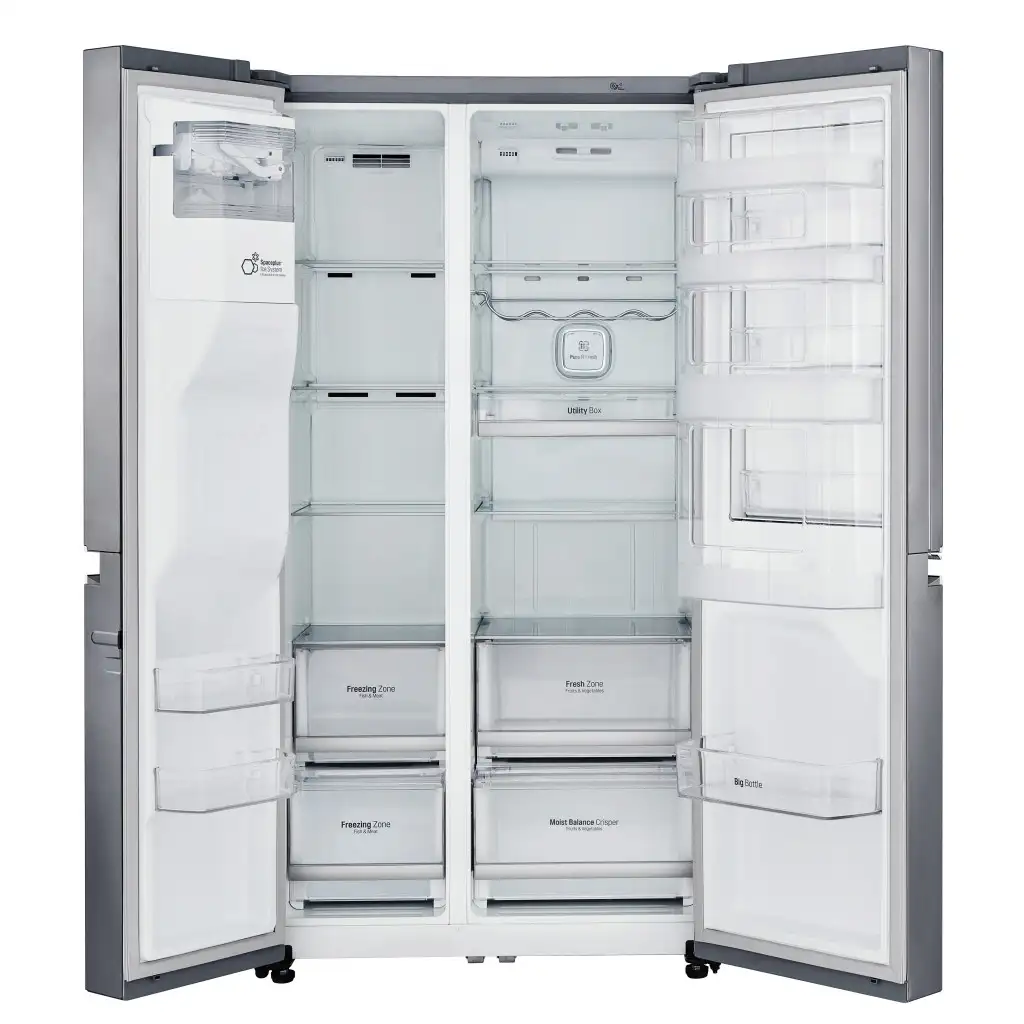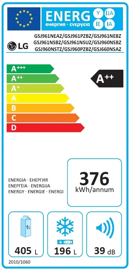 LG GSJ960PZBZ. Seadme paigaldus: Eraldiseisev, Toote värv: Roostevaba teras, Tootedisain: Kahepoolne. Neto kogumahutavus: 601 l, Kliimaklass: T, Müraemissiooni klass: C. Külmkapi netomahutavus: 405 l, Külmkapi brutomahutavus: 422 l. Sügavkülmiku netomahutavus: 196 l, Sügavkülmiku paigutus: Külgmine, Külmutusvõimsus: 12 kg/24 h. Energiatõhususe klass: F, Aastane energiakulu: 376 kWh, Energiatõhususe skaala: A-st G-ni