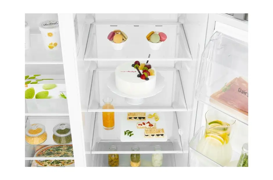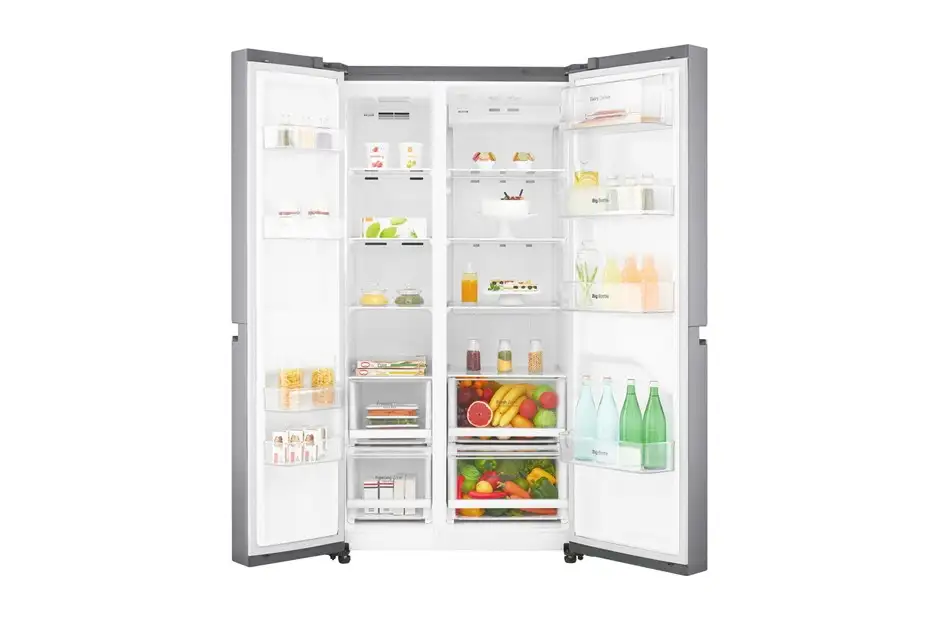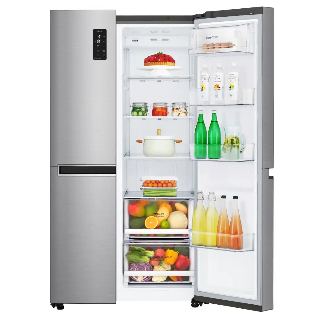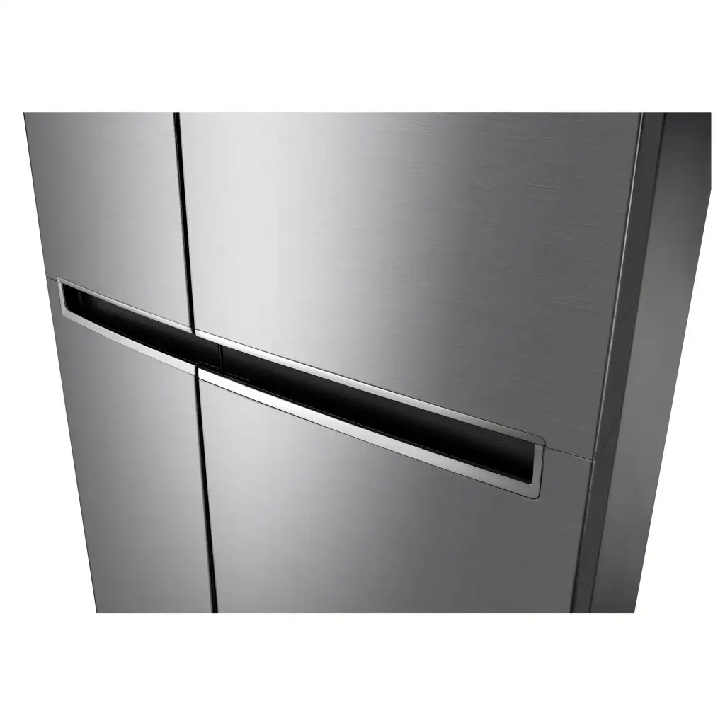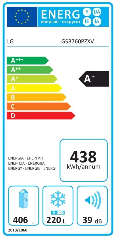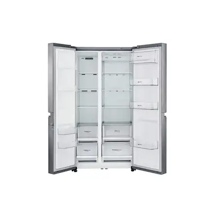 LG GSB760PZXV. Seadme paigaldus: Eraldiseisev, Tootedisain: Kahepoolne, Toote värv: Roostevaba teras. Neto kogumahutavus: 626 l, Kliimaklass: T, Müraemissiooni klass: C. Külmkapi netomahutavus: 406 l, Külmkapi brutomahutavus: 422 l. Sügavkülmiku netomahutavus: 220 l, Sügavkülmiku paigutus: Külgmine, Külmutusvõimsus: 12 kg/24 h. Energiatõhususe klass: F, Aastane energiakulu: 438 kWh, Energiatõhususe skaala: A-st G-ni