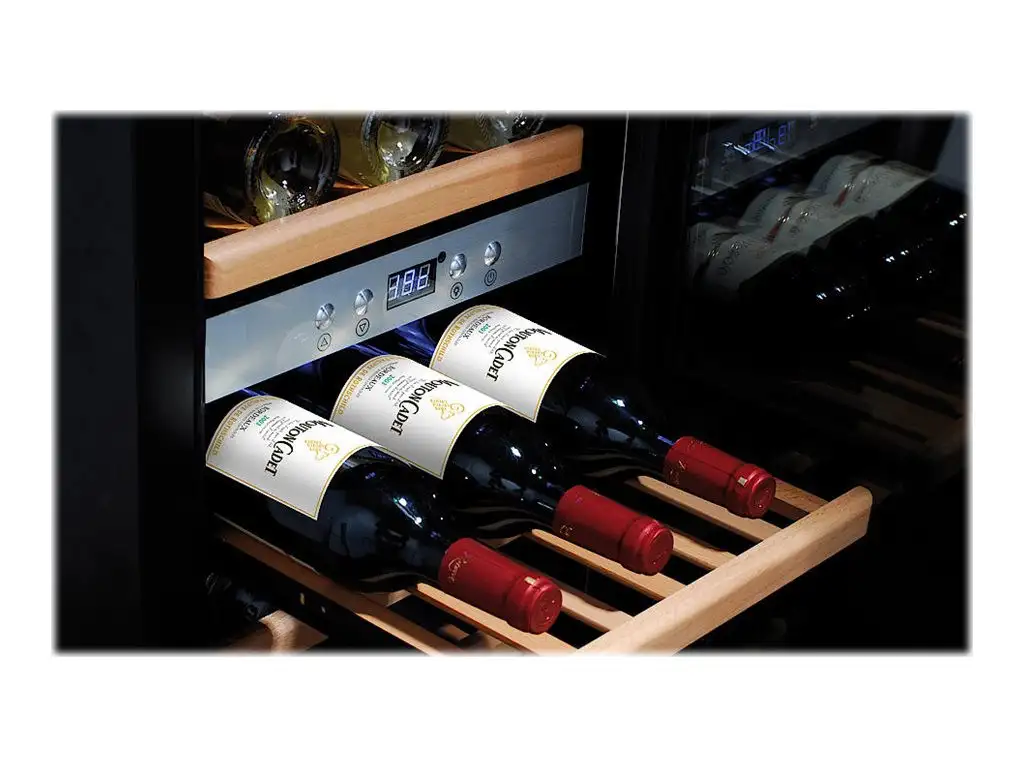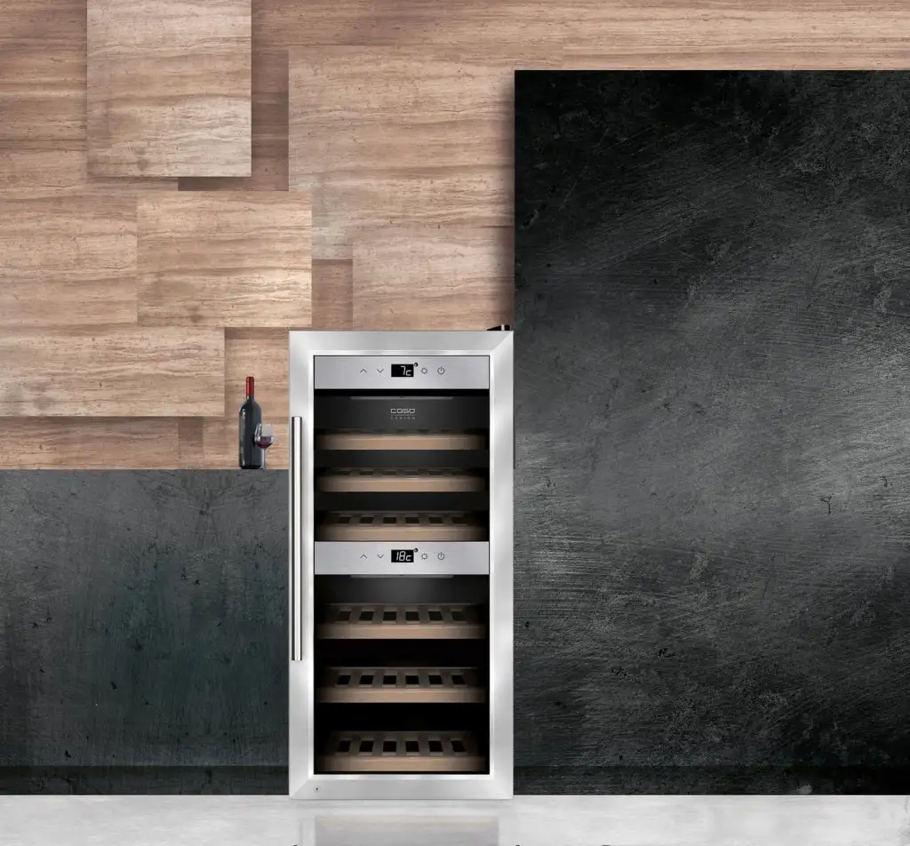 | Special features | High-quality wine storage with compressor technology,Two separate temperature zones, individually adjustable for white and red wine (WineSafe only one temperature zone),Low-vibration technology gives the wine the calm environment it needs,Active fan for a very even temperature per zone,Storage capacity for up to 24,Insulating glass with UV- filter, protects against loss of aroma,Excellent thermal insulation for energy-efficient operation,Electronically adjustable temperature from 5 ° – 22 °C,Blue actual cooling zone temperature LED display,On-demand interior illumination,Timeless design with elegant stainless steel front and double-glass insert,Ergonomic door handle,Ball-bearing supported pull-out trays with wooden storage racks,Quite operation |