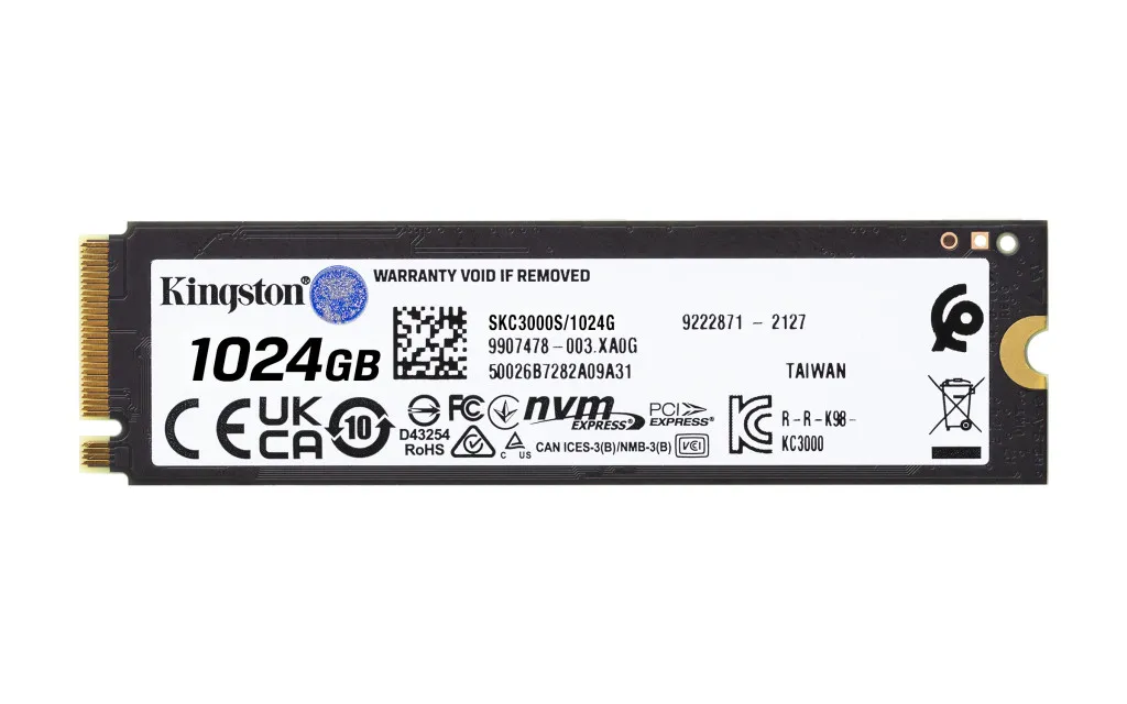 | Summary | Kingston Technology 1024G KC3000 M.2 2280 NVMe SSD. SSD capacity: 1 TB, SSD form factor: M.2, Read speed: 7000 MB/s, Write speed: 6000 MB/s, Component for: PC/Laptop |