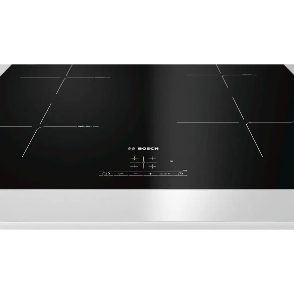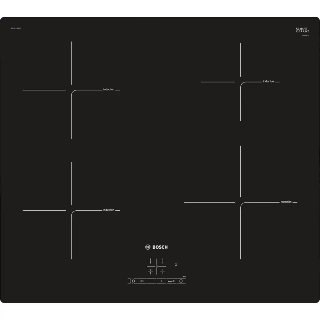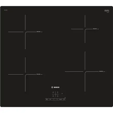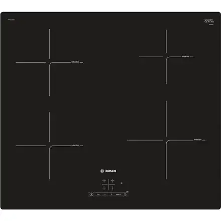 Bosch PIE611BB1E. Toote värv: Must, Seadme paigaldus: Sisseehitatud, Pliidiraua tüüp: Tsooniga induktsioonplaat. Kontrolli tüüp: Puudutus, Juhtimise paigutus: Esikülg. Ühendatud koormus (elekter): 7400 W. Laius: 592 mm, Sügavus: 522 mm, Kõrgus: 51 mm