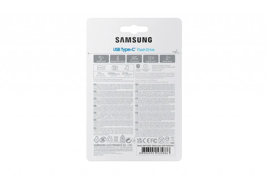 Samsung MUF-64DA. Maht: 64 GB, Seadme liides: USB tüüp-C, USB versioon: 3.2 Gen 1 (3.1 Gen 1), Lugemise kiirus: 400 MB/s. Toote kuju: Kork. Kaal: 3,4 g. Toote värv: Sinine