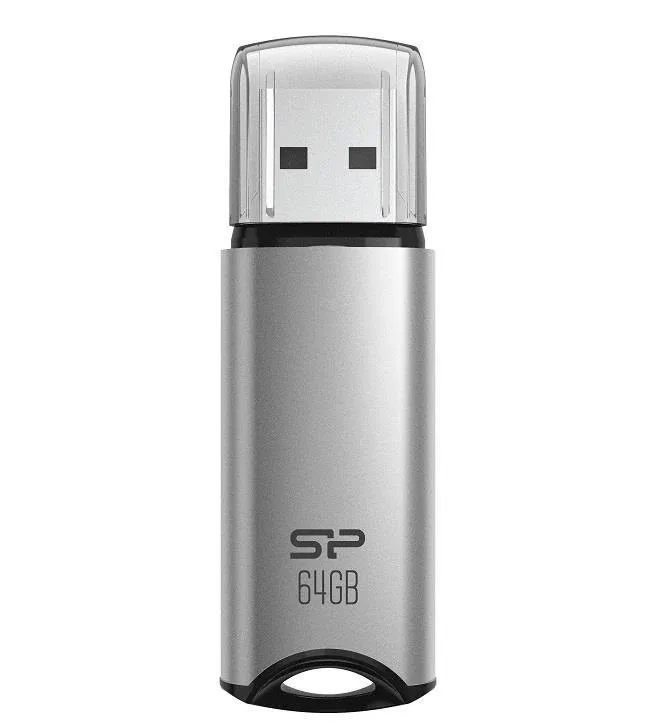 Silicon Power Marvel M02. Maht: 64 GB, Seadme liides: USB tüüp A, USB versioon: 3.2 Gen 1 (3.1 Gen 1). Toote kuju: Kork. Kaal: 9,5 g. Toote värv: Hõbe