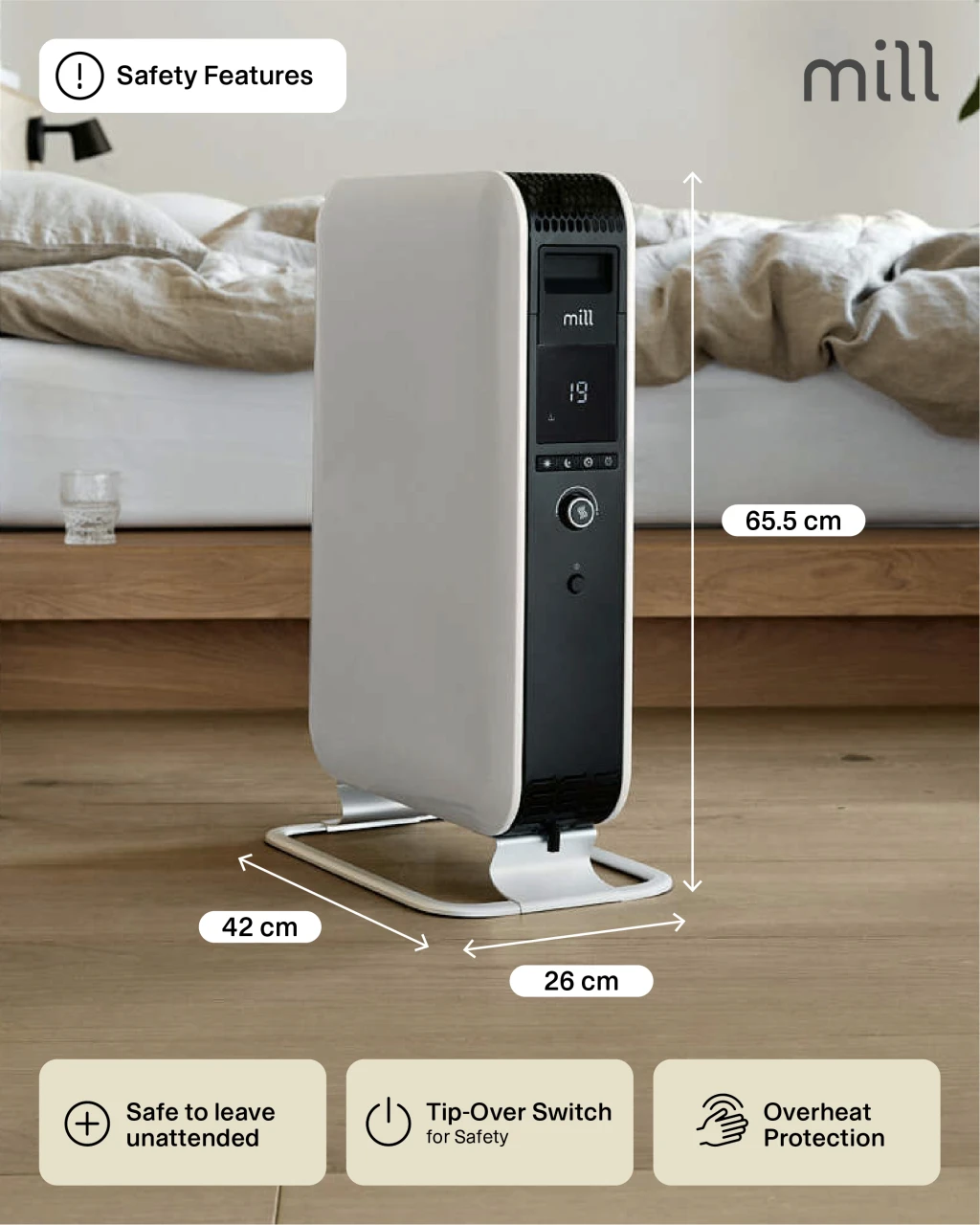 3 heat settings: 800 W/1200 W/2000 W Mill Heat Boost technology, Day/night thermostat, Over heating protection, Tip-over switch
