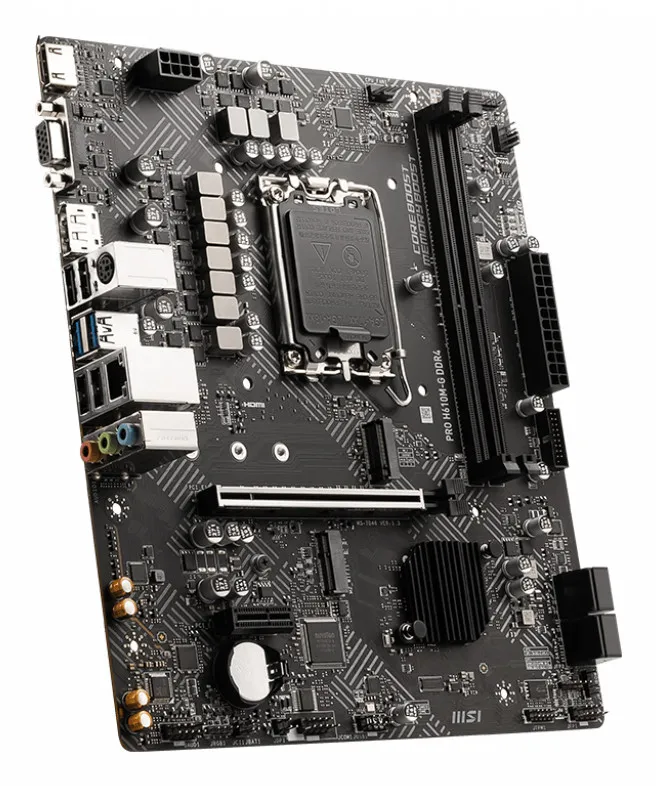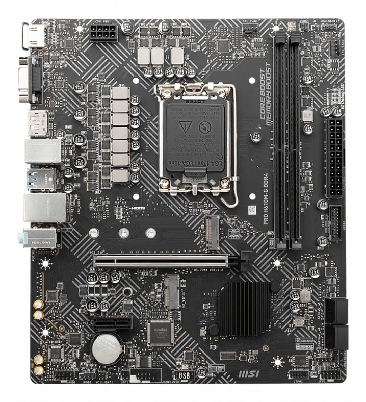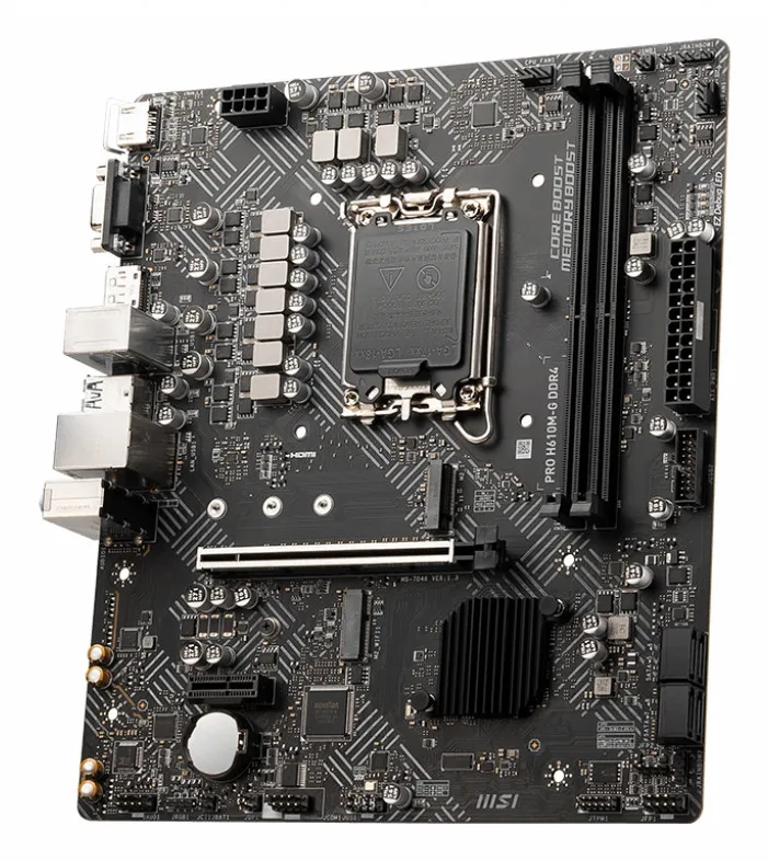 | Summary | MSI PRO H610M-G DDR4. Processor manufacturer: Intel, Processor socket: LGA 1700, Compatible processor series: Intel® Core™ i9. Supported memory types: DDR4-SDRAM, Maximum internal memory: 64 GB, Memory slots type: DIMM. Supported storage drive interfaces: M.2, SATA III, Supported storage drive types: SSD. Ethernet interface type: Gigabit Ethernet. Component for: PC, Motherboard form factor: micro ATX, Motherboard chipset family: Intel |