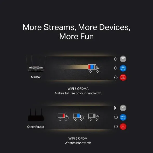 Streaming or gaming on multiple devices brings more fun without dragging down performance. MR80X supports OFDMA and MU-MIMO1 to power up your WiFi by allowing multiple clients to transmit at the same time. This delivers 4× greater network capacity and efficiency in traffic-dense environments.