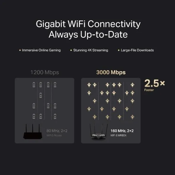 Doubling the bandwidth with 160 MHz channels,1 MR80X unlocks the limits of the previous channel width and provides next-level speeds for your devices. With WiFi 6 speeds up to 3 Gbps,2 finish large-file downloads in minutes and experience stunning 4K streaming without lag.