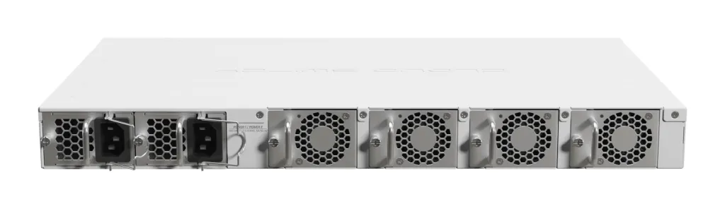 The two hot-swap power supplies support a high input voltage range: 100-240V. The board itself uses up to 45W of power, while the total maximum power consumption goes up to 77W with all the attachments. It can be a bit more power-hungry than the CRS504, but you would be too if you had 16x 25-Gigabit ports, wouldn’t you?