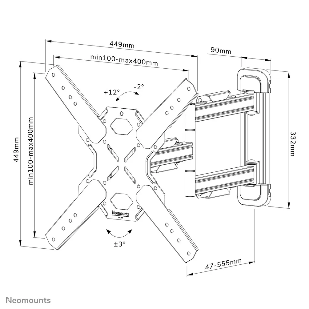 Neomounts WL40S-850BL14. Maksimaalne kaal (mahutavus): 40 kg, Ekraani minimaalne suurus: 81,3 cm (32"), Ekraani maksimaalne suurus: 165,1 cm (65"), Paigaldussüsteemi ühilduvus (min): 100 x 100 mm, Paigaldussüsteemi ühilduvus (max): 400 x 400 mm. Kaldenurk: -2 - 12°, Pöördenurga ulatus: 0 - 45°, Rotatsiooni nurk: 6°, Kaugus seinast (minimaalne): 4,7 cm, Kaugus seinast (maksimaalne): 55,5 cm. Toote värv: Must