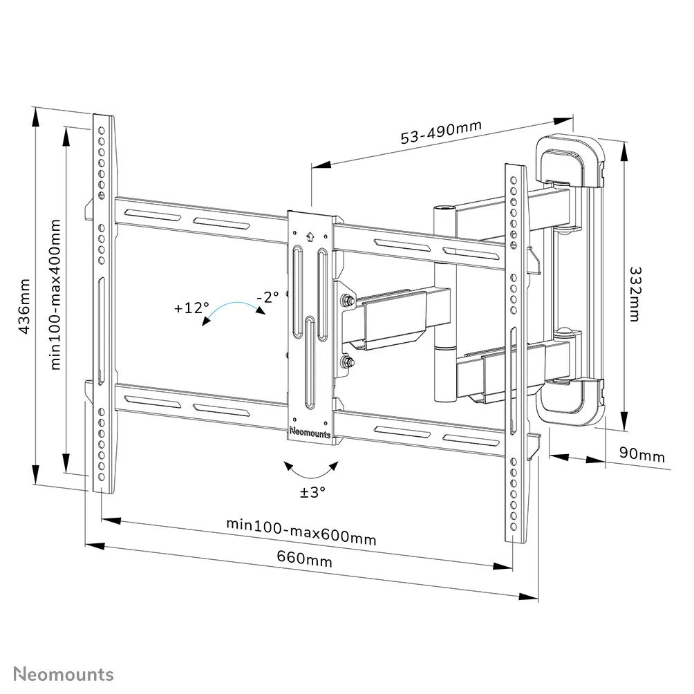 Neomounts WL40-550BL16. Maksimaalne kaal (mahutavus): 40 kg, Ekraani minimaalne suurus: 101,6 cm (40"), Ekraani maksimaalne suurus: 165,1 cm (65"), Paigaldussüsteemi ühilduvus (min): 200 x 100 mm, Paigaldussüsteemi ühilduvus (max): 600 x 400 mm. Kaldenurk: -2 - 12°, Pöördenurga ulatus: -45 - 45°, Rotatsiooni nurk: 6°, Kaugus seinast (minimaalne): 5,3 cm, Kaugus seinast (maksimaalne): 49 cm. Toote värv: Must