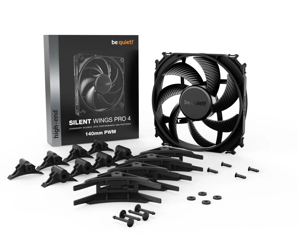 be quiet! SILENT WINGS PRO 4 | 140mm PWM. Tüüp: Ventilaator, Ventilaatori läbimõõt: 14 cm, Pöörlemiskiirus (max): 2400 RPM, Õhuvool: 165,5 m³/h, Maksimaalne õhusurve: 3,64 mmH2O, Laagri tüüp: Fluid Dynamic Bearing (FDB). Pinge: 7 - 13.2 V. Laius: 140 mm, Sügavus: 140 mm, Kõrgus: 25 mm. Toote värv: Must