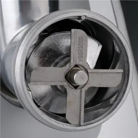 Stainless steel crossed-blade knife with 4 blades, Feed pan and grinding discs made of stainless steel, Screw ring, worm housing and worm made of die cast aluminium.