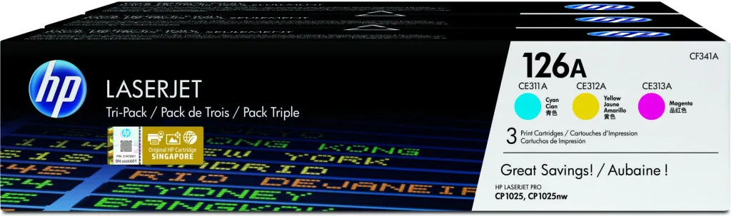 HP 126A 3-pack Cyan/Magenta/Yellow Original LaserJet Toner Cartridges. Värvilise toonerkasseti prinditavate lehekülgede arv: 1000 lehekülge, Printimisvärvid: Tsüaan, Magenta, Kollane, Kogus pakis: 3 tk
