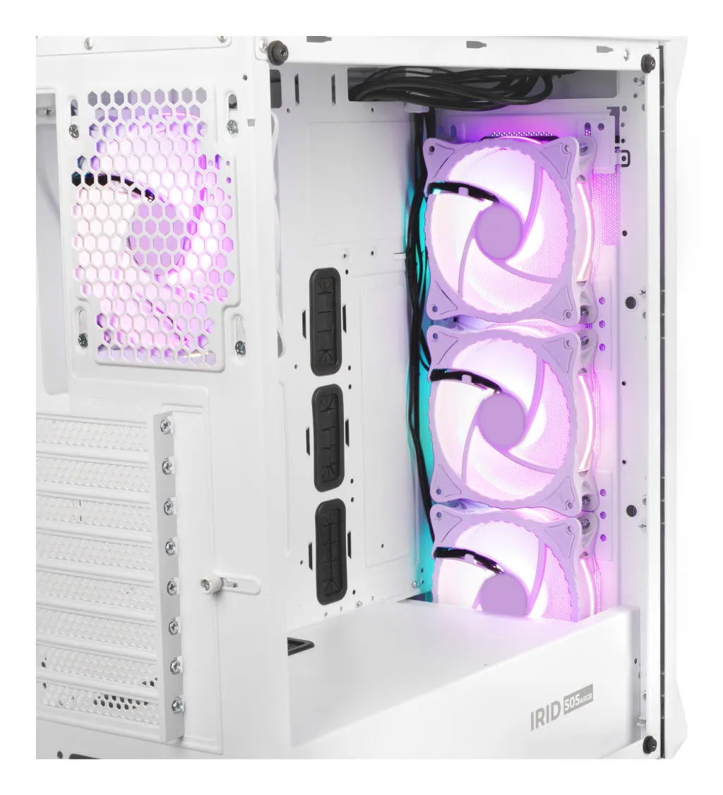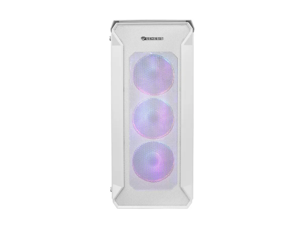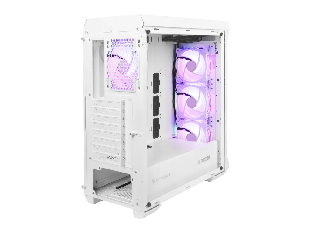 GENESIS Irid 505 ARGB. Toote kuju: Midi Tower, Tüüp: PC, Toote värv: Valge. Toiteploki asukoht: Põhi, Toetatud elektritoite tarne vormi faktorid: ATX. Installitud esiventilaatorid: 3x 120 mm, Toetatud esiventilaatorite läbimõõt: 120,140 mm, Installitud tagaventilaatorid: 1x 120 mm. Toetatud kõvakettasuurused: 2.5,3.5". Laius: 220 mm, Sügavus: 447 mm, Kõrgus: 510 mm