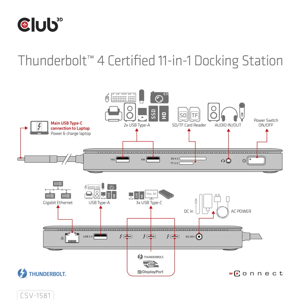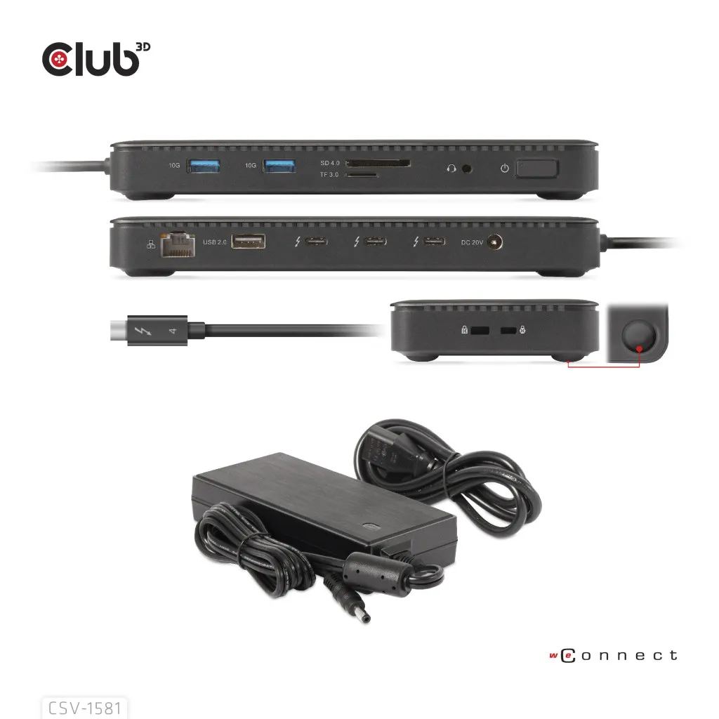CLUB3D CSV-1581. Ühenduvustehnoloogia: Dokkimine, Hostiliides: Thunderbolt 4, USB Power Delivery kuni: 140 W. Ethernet LAN-i andmeedastuskiirused: 1000 Mbit/s. Toote värv: Must, Ühilduvad mälukaardid: SD