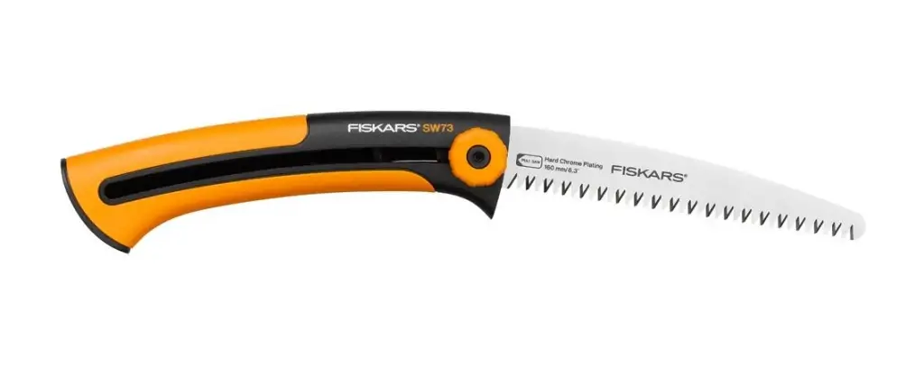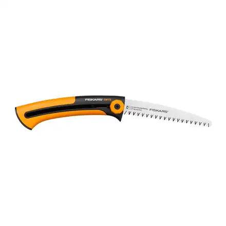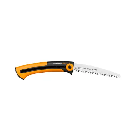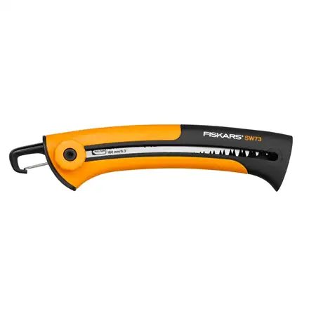 Fiskars Xtract™ Garden Saw (L) SW75 is a highly efficient tree saw designed to cut fresh wood. This is the smallest of the Xtract saws and has a blade length of 160 mm with amore limited sawing capacity up but which nevertheless works for most smaller cuts where a lopper can't go. The design features a handy belt clip which retracts when in use while the SoftGrip™ handle ensures a safe grip. There is also a finger guard which protects fingers from sliding to the blade part during sawing. Its highly sharp blade cuts on the pull stroke.
