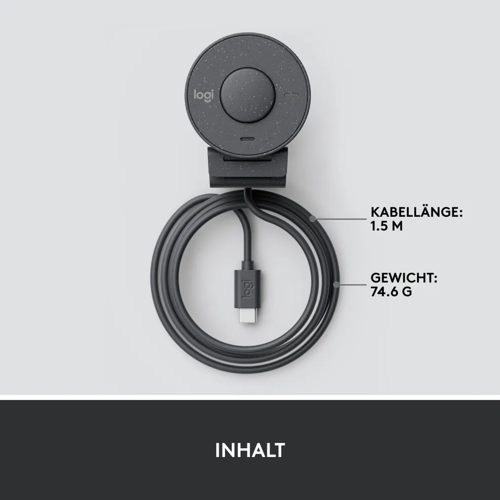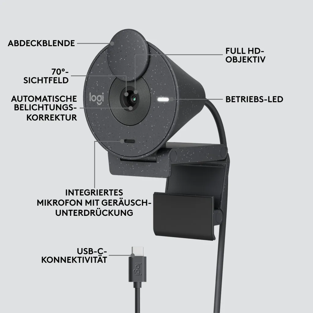 Logitech Brio 300. Megapiksel: 2 MP, Maksimaalne video resolutsioon: 1920 x 1080 pikslit, Kaamera HD tüüp: Full HD. Liides: USB-C, Toote värv: Grafiit, Kinnituse tüüp: Klamber. Toetatud Windowsi operatsioonisüsteemid: Windows 10, Windows 11, Windows 8, Windows 8.1, Toetatud Maci operatsioonisüsteemid: Mac OS X 10.10 Yosemite, Mac OS X 10.11 El Capitan, Mac OS X 10.12 Sierra, Mac OS X 10.13 High..., Muud toetatud operatsioonisüsteemid: ChromeOS. Jätkusuutlikkuse sertifikaadid: CarbonNeutral, Forest Stewardship Council (FSC). Laius: 53,1 mm, Sügavus: 45 mm, Kõrgus: 65,6 mm