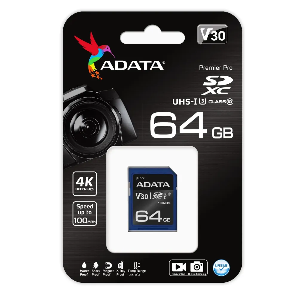 | Summary | ADATA ASDX64GUI3V30S-R. Capacity: 64 GB, Flash card type: SDXC, Flash memory class: Class 10, Internal memory type: UHS-I, Read speed: 100 MB/s, Write speed: 60 MB/s, UHS Speed Class: Class 3 (U3), Video Speed Class: V30. Product colour: Black, Blue |