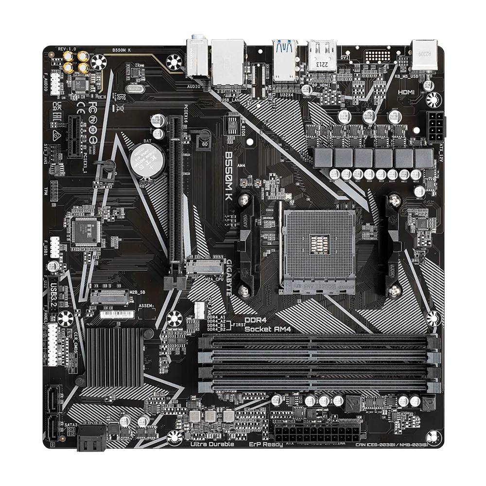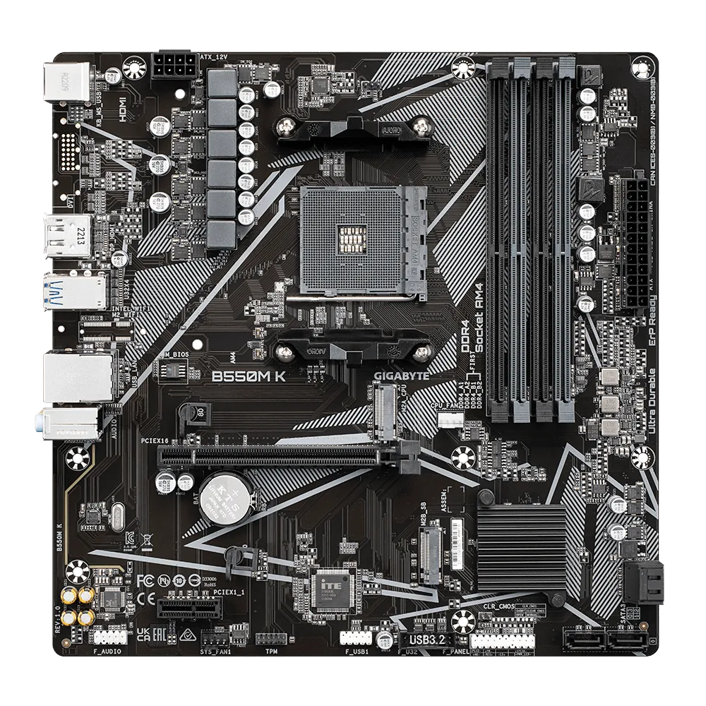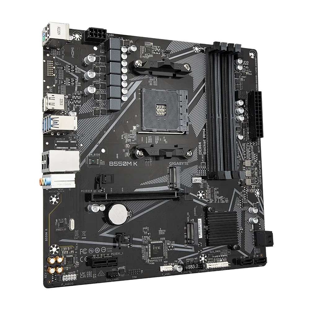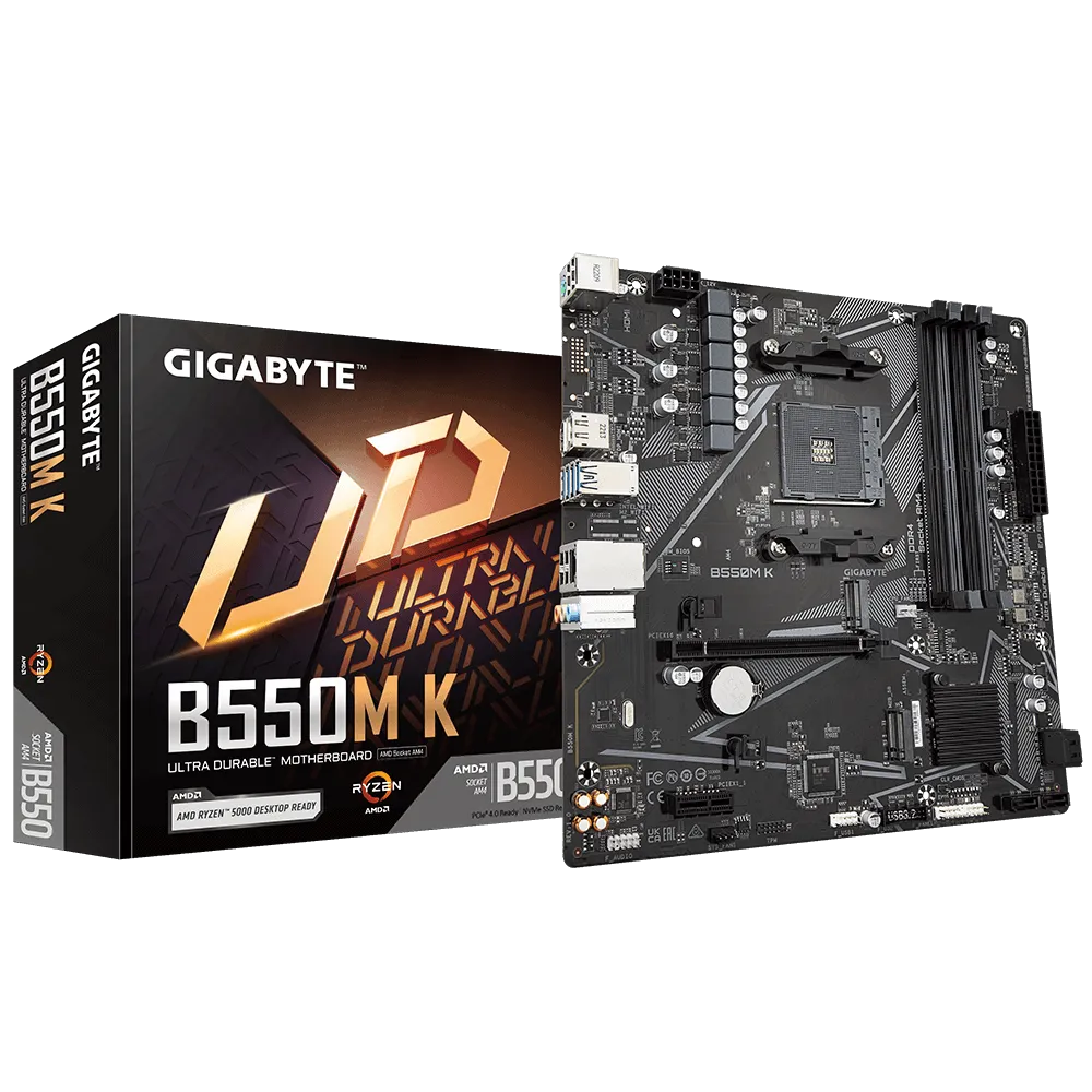 Gigabyte B550M K 1.0. Protsessori tootja: AMD, Protsessori pesa: Pesa AM4, Ühilduvad protsessoriseeriad: AMD Ryzen™ 5. Toetatud mälutüübid: DDR4-SDRAM, Maksimaalne sisemälu: 128 GB, Mälupesa tüüp: DIMM. Kõvaketta ühenduse tüüp: M.2, PCI Express 3.0, PCI Express 4.0, SATA, Toetatud ketaste tüübid: SSD, RAID-tasemed: 0, 1, 10. Graafikaadapteri perekond: AMD, Maksimaalne resolutsioon: 5120 x 2880 pikslit. Ethernet-liidese tüüp: Gigabit Ethernet