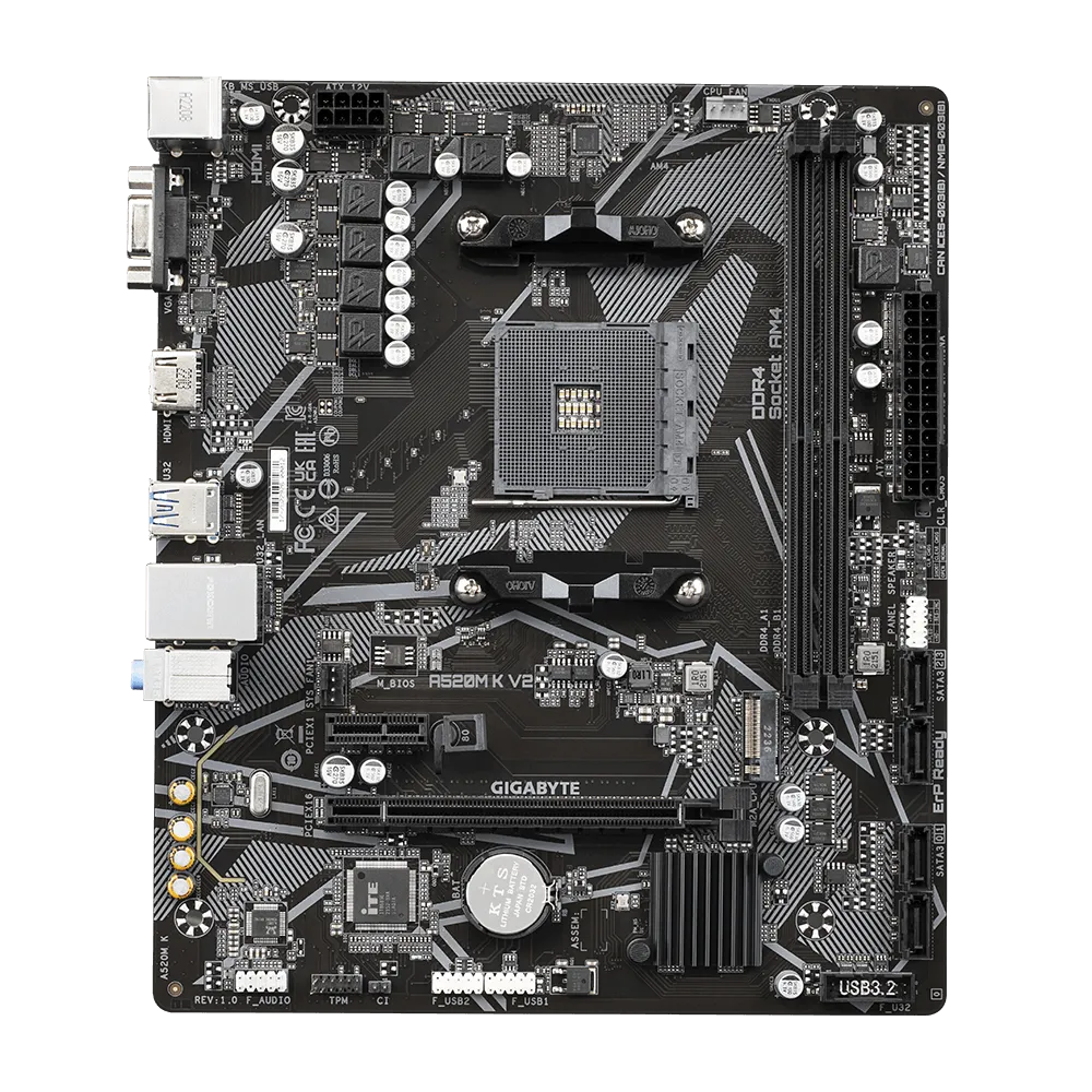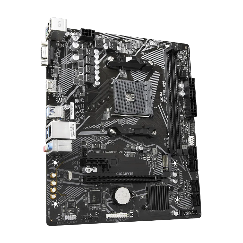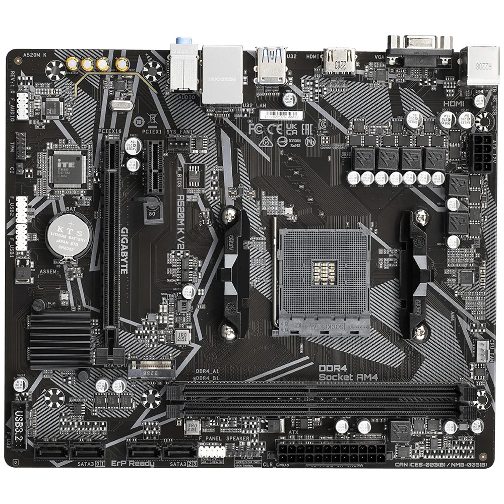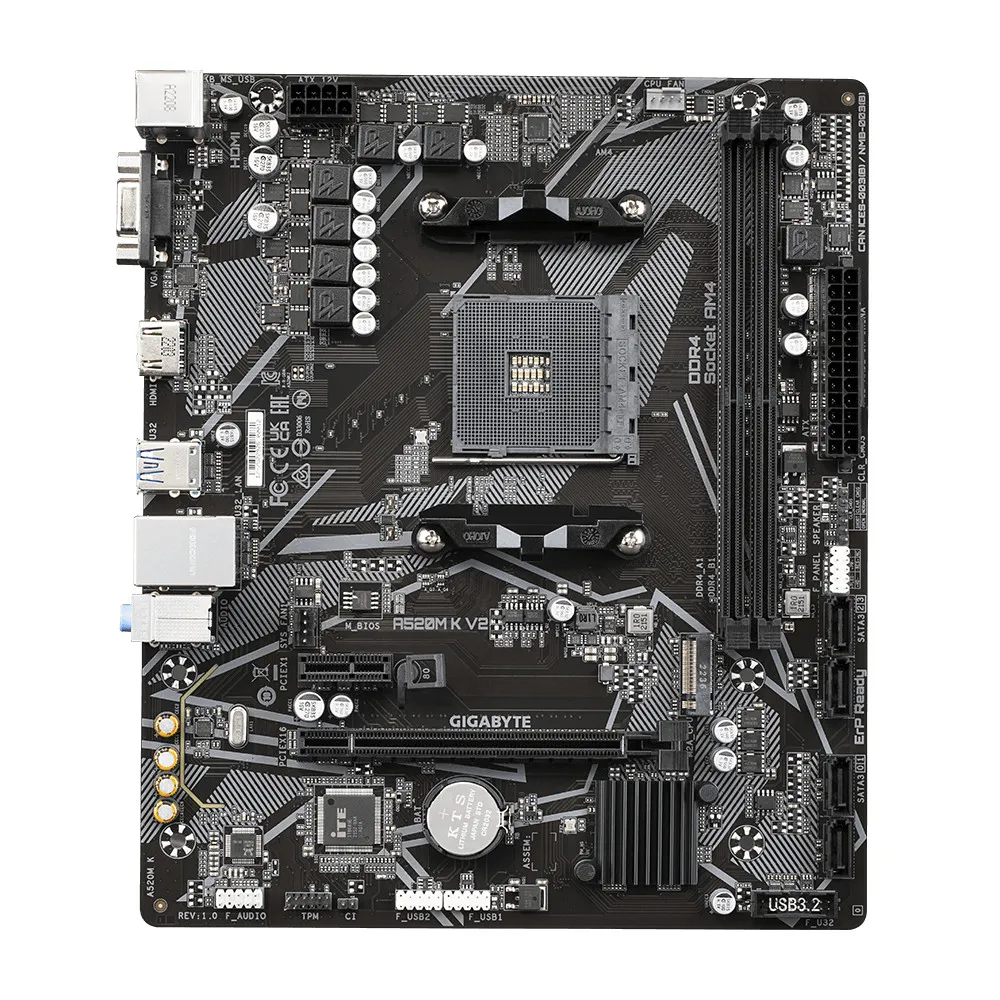 Gigabyte A520M K V2. Protsessori tootja: AMD, Protsessori pesa: Pesa AM4, Ühilduvad protsessoriseeriad: AMD Ryzen™ 3, AMD Ryzen™ 5, AMD Ryzen™ 7, 3rd Generation AMD Ryzen™ 9, AMD Ryzen 9 5th Gen. Toetatud mälutüübid: DDR4-SDRAM, Maksimaalne sisemälu: 64 GB, Mälupesa tüüp: DIMM. Kõvaketta ühenduse tüüp: M.2, SATA III, Toetatud ketaste tüübid: HDD & SSD, RAID-tasemed: 0, 1, 10. Maksimaalne resolutsioon: 4096 x 2160 pikslit. USB-pistmiku tüüp: USB tüüp A