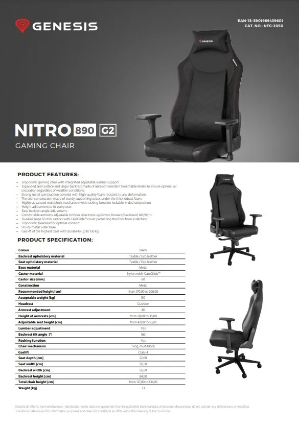 Seat height adjustment: 47 - 53 cm; Armrest adjustment: 3D; Height of armrests: 28 - 36 cm
