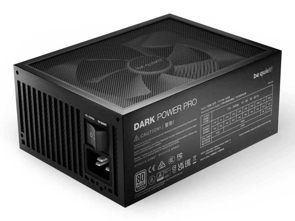 be quiet! Dark Power Pro 13 | 1600W. Koguvõimsus: 1600 W, AC-sisendpinge: 115 - 240 V, Tipuvõimsus: 1700 W. Emaplaadi toitepistmik: 20+4 pin ATX, Emaplaadi toitekaabli pikkus: 60 cm, SATA toitekaabli pikkus: 500,600,750,800,900,950,1050 mm. Otstarve: PC, Toiteploki (PSU) standard: ATX, 80 PLUS sertifikaat: 80 PLUS Titanium. Toote värv: Must, Jahutuse tüüp: Aktiivne, Ventilaatori läbimõõt: 13,5 cm. Kaablid kaasa arvatud: CPU, PCIe, Peripheral (Molex), SATA