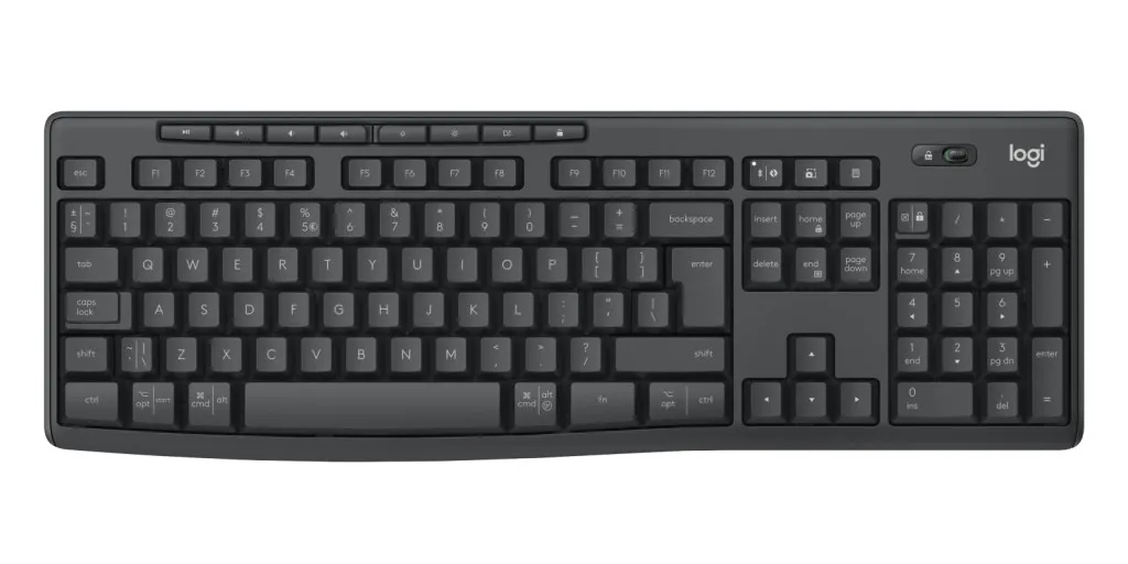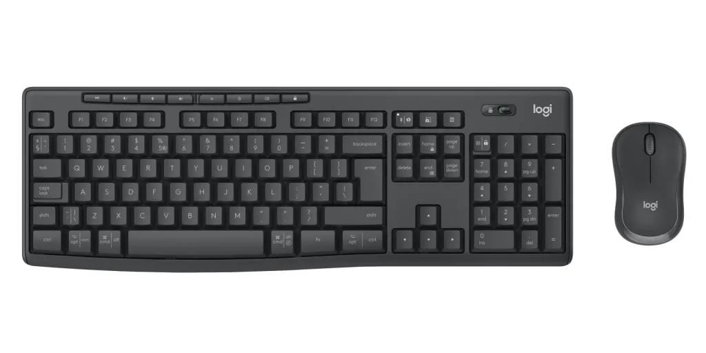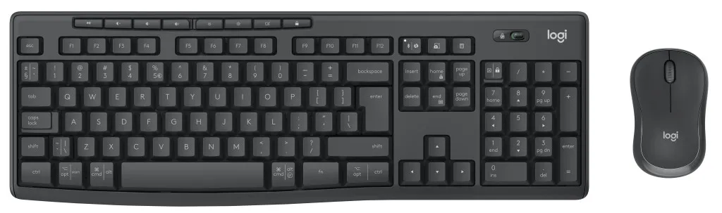 Logitech 920-012077. Klaviatuuri kujutegur: Täissuuruses (100%). Klaviatuuri stiil: Sirge. Ühenduvustehnoloogia: Juhtmevaba, Seadme liides: RF juhtmeta ühendus + Bluetooth, Klaviatuuri klahvilüliti: Membraaniga klahvlüliti, Klaviatuuri paigutus: QWERTY, Klaviatuuri klahvide arv: 112, Soovituslik kasutus: Kontor. Toote värv: Grafiit. Hiir kaasa arvatud