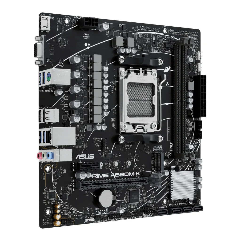 ASUS PRIME A620M-K. Protsessori tootja: AMD, Protsessori pesa: Protsessoripesa AM5, Ühilduvad protsessoriseeriad: AMD Ryzen 7000 Series. Toetatud mälutüübid: DDR5-SDRAM, Maksimaalne sisemälu: 96 GB, Mälukanalid: Kahe kanaliga. Kõvaketta ühenduse tüüp: M.2, SATA III, Toetatud ketaste tüübid: HDD & SSD. Ethernet-liidese tüüp: Kiire Ethernet, Gigabit Ethernet. Komponent: PC, Emaplaadi kujutegur: Mikro ATX, Emaplaadi kiibistik: AMD