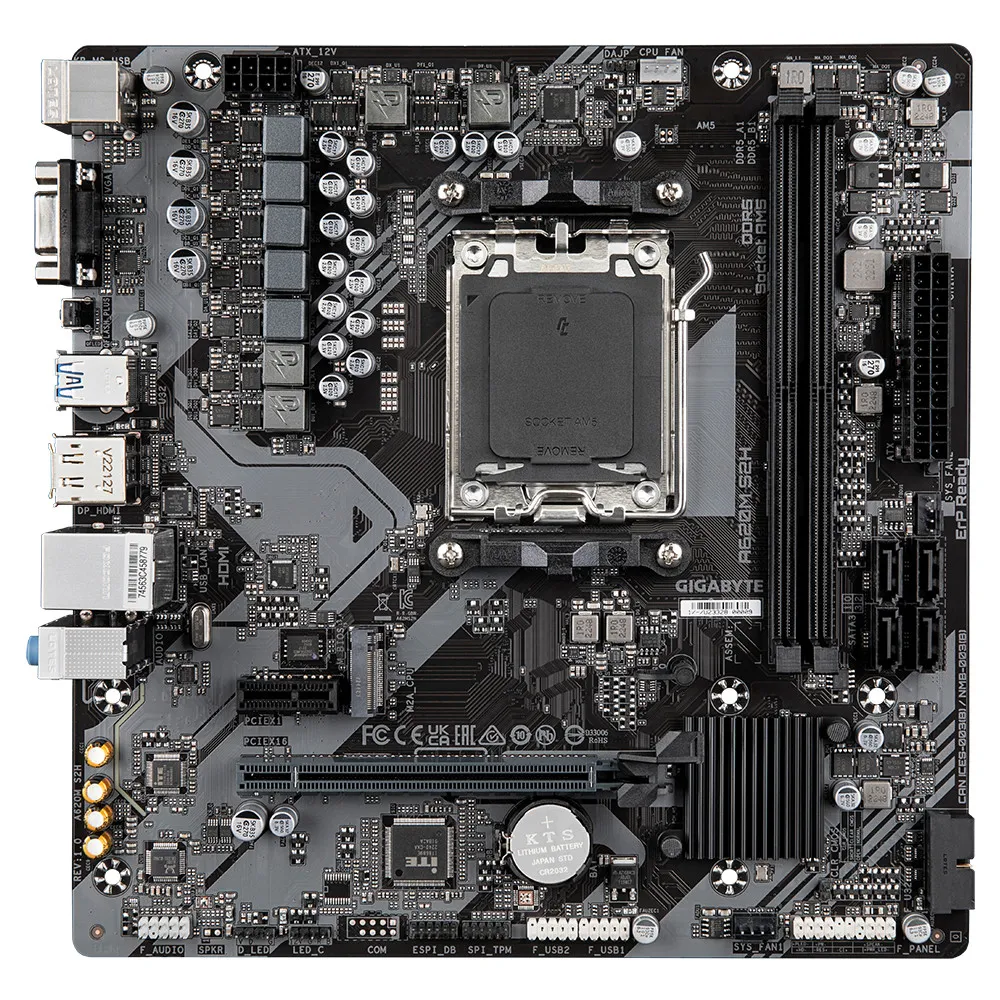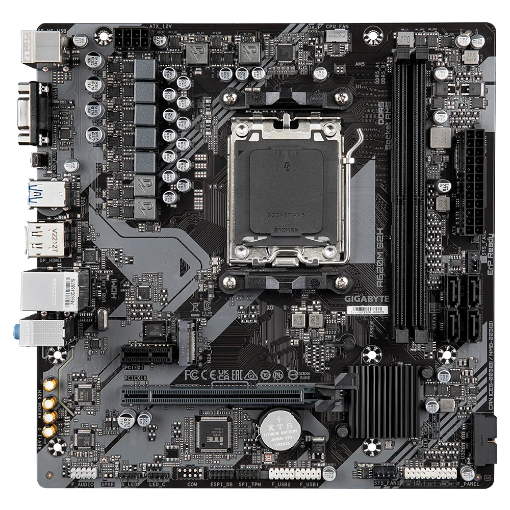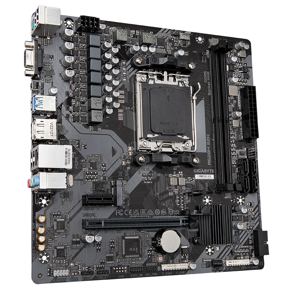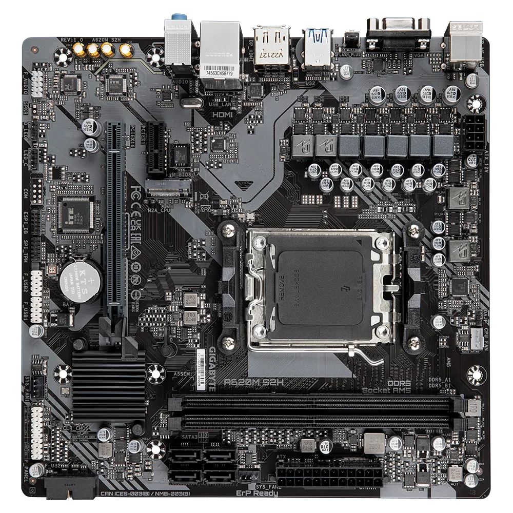 Gigabyte A620M S2H. Protsessori tootja: AMD, Protsessori pesa: Protsessoripesa AM5, Ühilduvad protsessoriseeriad: AMD Ryzen™ 5, AMD Ryzen 7 7th Gen, AMD Ryzen 9 7th Gen. Toetatud mälutüübid: DDR5-SDRAM, Maksimaalne sisemälu: 96 GB, Mälupesa tüüp: DIMM. Kõvaketta ühenduse tüüp: M.2, SATA III, Toetatud ketaste tüübid: HDD & SSD, RAID-tasemed: 0, 1, 10. Maksimaalne resolutsioon: 4096 x 2160 pikslit. USB-pistmiku tüüp: USB tüüp A, USB tüüp-C