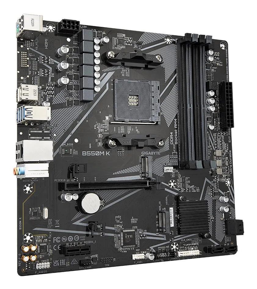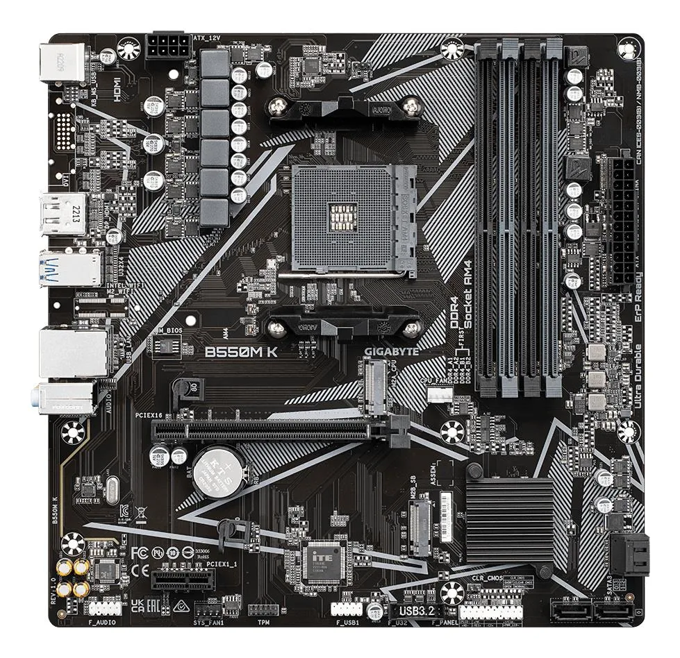 | Summary | GIGABYTE B550M K Motherboard - AMD Ryzen 5000 CPUs, up to 4733MHz DDR4, 1xPCIe 4.0 + 1xPCIe 3.0 M.2, 1GbE LAN, USB 3.2 Gen 1. Processor manufacturer: AMD, Processor socket: Socket AM4, Compatible processor series: AMD Ryzen 3000 Series, AMD Ryzen 4000 Series, AMD Ryzen 5000 Series. Supported memory types: DDR4-SDRAM, Maximum internal memory: 128 GB, Memory slots type: DIMM. Supported storage drive interfaces: M.2, SATA, Supported storage drive types: HDD & SSD, RAID levels: 0, 1, 10. Maximum resolution: 5120 x 2880 pixels. Ethernet interface type: Gigabit Ethernet, LAN controller: Realtek RTL8111H |