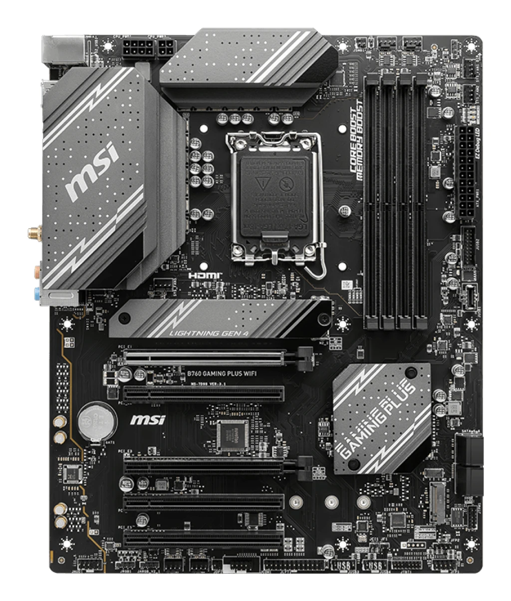 MSI B760 GAMING PLUS WIFI. Protsessori tootja: Intel, Protsessori pesa: LGA 1700, Ühilduvad protsessoriseeriad: Intel® Celeron®, Intel® Pentium® Gold. Toetatud mälutüübid: DDR5-SDRAM, Maksimaalne sisemälu: 192 GB, Mälupesa tüüp: DIMM. Kõvaketta ühenduse tüüp: M.2, SATA, RAID-tasemed: 0, 1, 5, 10. Ethernet-liidese tüüp: 2.5 Gigabit Ethernet, LAN-kontroller: Dragon RTL8125BG, Wi-Fi standard: Wi-Fi 6E (802.11ax). Komponent: PC, Emaplaadi kujutegur: ATX, Emaplaadi kiibistik: Intel