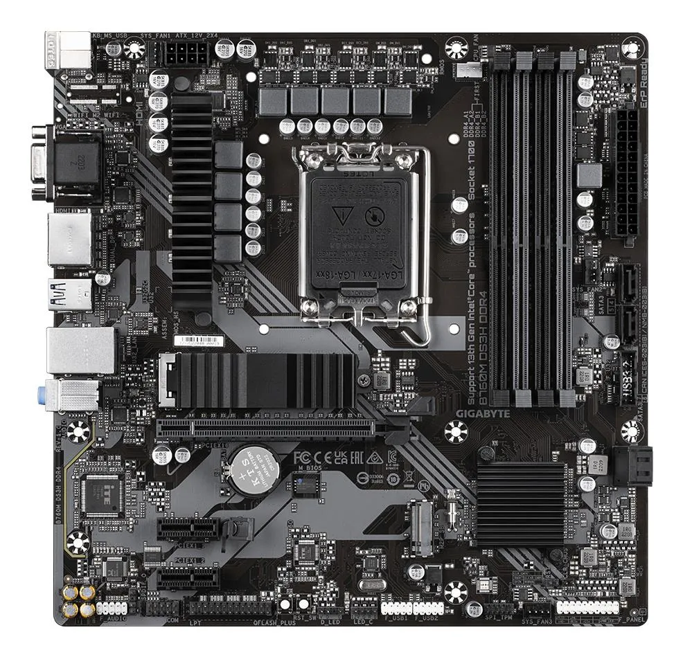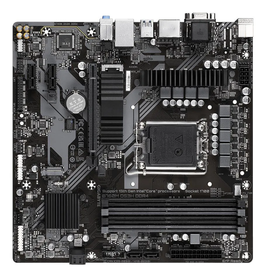 | Summary | GIGABYTE B760M DS3H DDR4 Motherboard - Supports Intel Core 14th Gen CPUs, 6+2+1 Phases Digital VRM, up to 5333MHz DDR4 (OC), 2xPCIe 4.0 M.2, 2.5GbE LAN, USB 3.2 Gen2. Processor manufacturer: Intel, Processor socket: LGA 1700, Compatible processor series: Intel® Celeron®, Intel® Core™ i3, Intel® Core™ i5, Intel® Core™ i7, Intel® Core™ i9,.... Supported memory types: DDR4-SDRAM, Maximum internal memory: 128 GB, Memory slots type: DIMM. Supported storage drive interfaces: M.2, SATA III, Supported storage drive types: HDD & SSD, RAID levels: 0, 1, 5, 10. Maximum resolution: 4096 x 2304 pixels. Ethernet interface type: 2.5 Gigabit Ethernet |