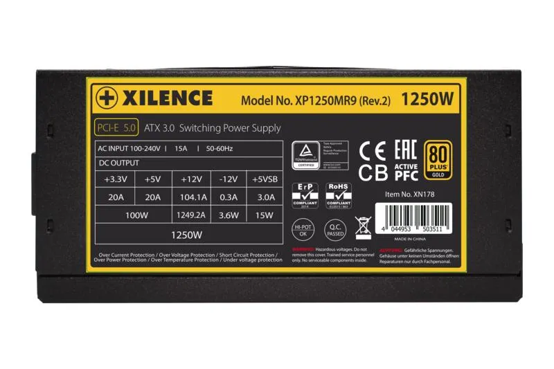 | Summary | Xilence XP1250MR9.2. Total power: 1250 W, AC input voltage: 100 - 240 V, AC input frequency: 50/60 Hz. Motherboard power connector: 20+4 pin ATX, Motherboard power cable length: 65 cm, Cabling type: Fully-Modular. Purpose: PC, Power supply unit (PSU) form factor: ATX, 80 PLUS certification: 80 PLUS Gold. Product colour: Black, Red, Cooling type: Active, Fan diameter: 14 cm. Compliance certificates: RoHS, WEEE |