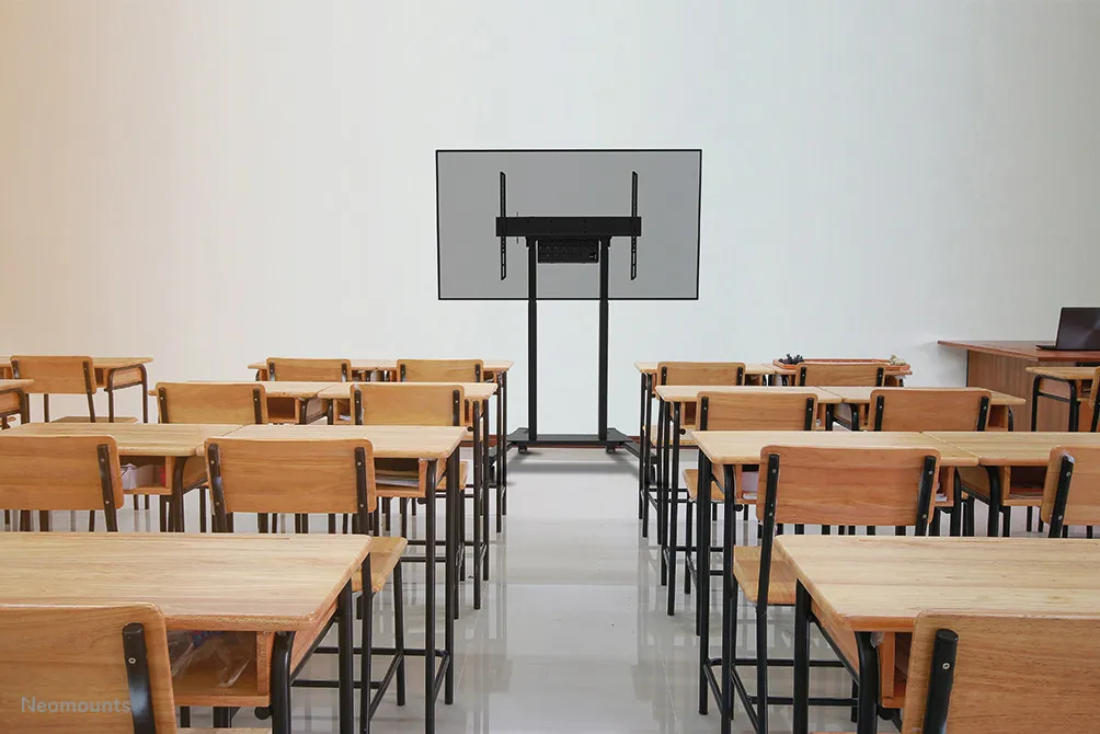 The Neomounts by Newstar FL55-875BL1 is a mobile floor stand for displays up to 100" with a maximum weight capacity of 110 kg. The trolley has 65 cm motorized height adjustment (35 mm/second), is operated with a wired remote control and features an anti-collision system for extra safety. A lockable, ventilated hardware compartment with cable opening is included and optional for installation. The trolley features practical handles and four solid 10 cm double locking caster wheels that allow you to move and use the floor stand wherever you like. Due to the large caster wheels, thresholds or carpets are no challenge to the FL55-875BL1. The open design wheelbase allows easy access to the (touch) display and enables easier movement around objects. The included cable duct, optional to install, conceal and route cables from floor stand to screen. A practical cable management bracket at the back of the trolley ensure easy and safe relocation. Additionally, at the bottom of the trolley a space with tie wrap holes is available to install a power strip. The floor stand is packed partially pre-assembled, to ensure fast and easy installation. The display can be secured by locking the brackets using a padlock (not included). Additionally, the FL55-875BL1 is compactly packed for optimized transportation and storage. The AFL-875BL1 videobar & multimedia kit is optionally available and enables the installation of a separate cam shelf and multimedia device shelf to the trolley. Included to the kit is an adapter for the Logitech Rally Bar (Mini). In addition, the multimedia shelf is suitable for installation of i.a. the Logitech Tap.
