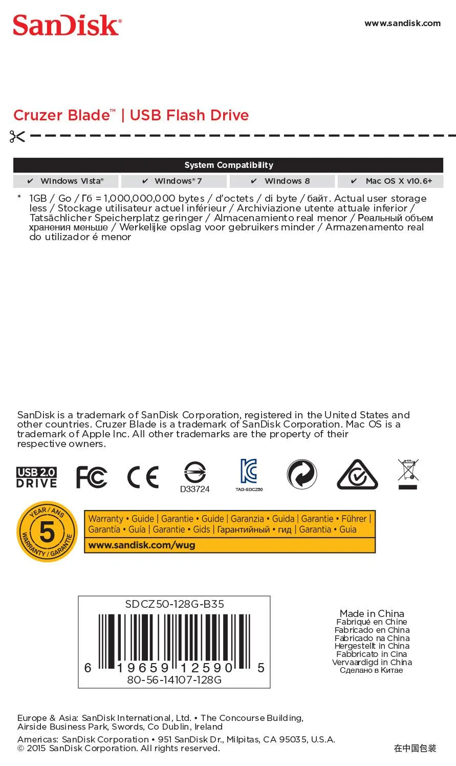 | Summary | SanDisk Cruzer Blade. Capacity: 128 GB, Device interface: USB Type-A, USB version: 2.0. Form factor: Capless. Weight: 2.5 g. Product colour: Black, Red |