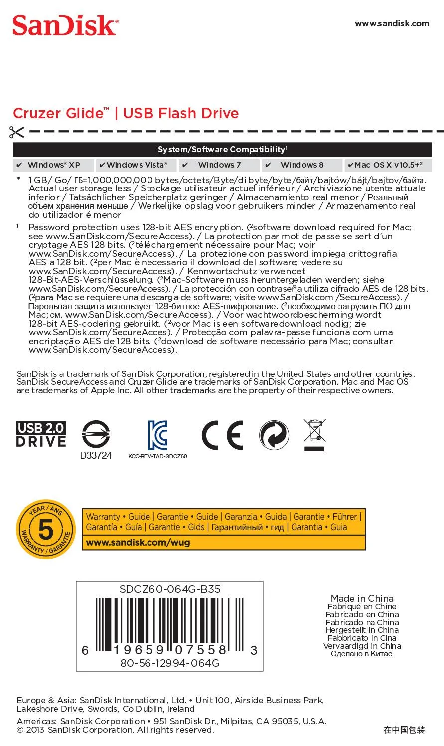 | Summary | SanDisk Cruzer Glide. Capacity: 64 GB, Device interface: USB Type-A, USB version: 2.0. Form factor: Slide. Password protection. Weight: 6.8 g. Product colour: Black, Red |