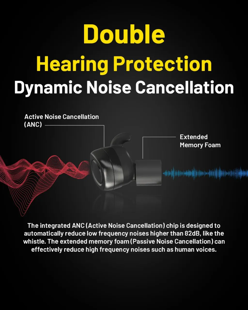 The integrated ANC (Active Noise Cancellation) chip is designed to automatically reduce low frequency noises higher than 82dB, like the whistle. The extended memory foam (Passive Noise Cancellation) can effectively reduce high frequency noises such as human voices.