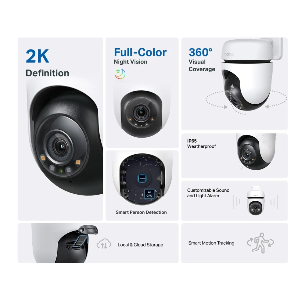 TP-Link Tapo C510W. Tüüp: IP süsteemiga turvakaamera, Toetatud paigutus: Hoonesisene & hooneväline, Ühenduvustehnoloogia: Juhtmevaba. Kinnituse tüüp: Lagi, Toote värv: Valge, Must, Toote kuju: Ülepea. Objektiivi vaatenurk, horisontaalne: 360°, Objektiivi vaatenurk, vertikaalne: 130°, Kaldenurk: 0 - 130°. Anduri tüüp: CMOS, Optilise sensori suurus: 25,4 / 2,8 mm (1 / 2.8"). Fikseeritud fookuskaugus: 3,9 mm