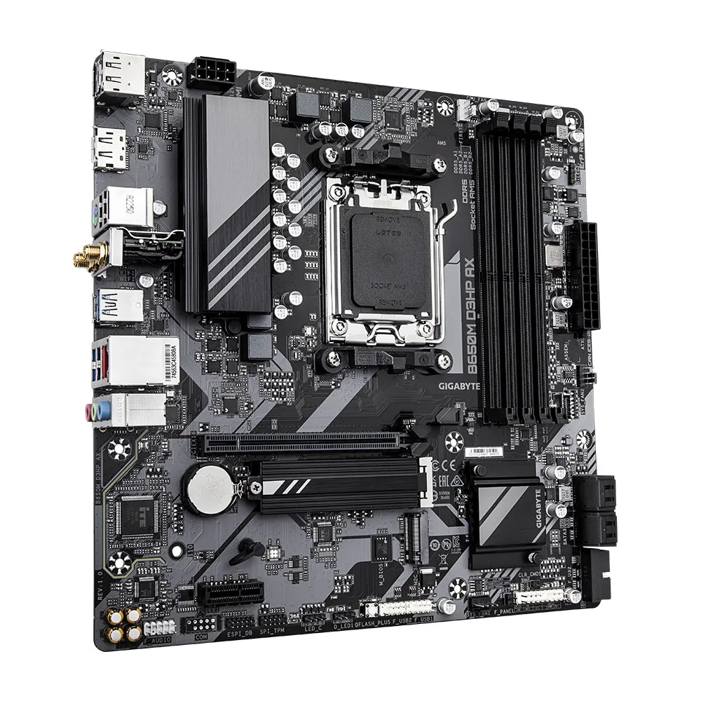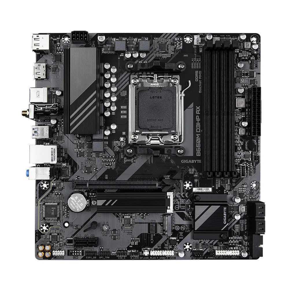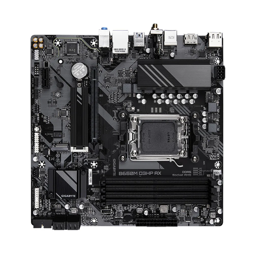 Gigabyte B650M D3HP AX. Protsessori tootja: AMD, Protsessori pesa: Protsessoripesa AM5, Ühilduvad protsessoriseeriad: AMD Ryzen 5 7th Gen, AMD Ryzen 7 7th Gen, AMD Ryzen 9 7th Gen. Toetatud mälutüübid: DDR5-SDRAM, Maksimaalne sisemälu: 192 GB, Mälupesa tüüp: DIMM. Kõvaketta ühenduse tüüp: M.2, PCI Express 4.0, SATA III, Toetatud ketaste tüübid: HDD & SSD, RAID-tasemed: 0, 1, 10. Maksimaalne resolutsioon: 4096 x 2160 pikslit. USB-pistmiku tüüp: USB tüüp A, USB tüüp-C