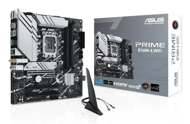 | Summary | ASUS PRIME B760M-A WIFI. Processor manufacturer: Intel, Processor socket: LGA 1700, Compatible processor series: Intel® Celeron®, Intel® Core™ i3, Intel® Core™ i5, Intel® Core™ i7, Intel® Core™ i9,.... Supported memory types: DDR5-SDRAM, Maximum internal memory: 128 GB, Memory slots type: DIMM. Supported storage drive interfaces: M.2, SATA III, Supported storage drive types: HDD & SSD, RAID levels: 0, 1, 5, 10. Ethernet interface type: 2.5 Gigabit Ethernet, Fast Ethernet, Gigabit Ethernet, Top Wi-Fi standard: Wi-Fi 6 (802.11ax), Wi-Fi standards: 802.11a, 802.11b, 802.11g, Wi-Fi 4 (802.11n), Wi-Fi 5 (802.11ac), Wi-Fi 6 (802.11ax). Component for: PC, Motherboard form factor: micro ATX, Motherboard chipset family: Intel |