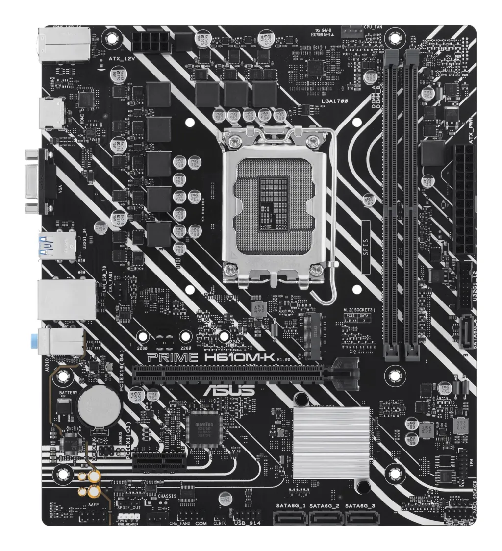 | Summary | ASUS Prime H610M-K. Processor manufacturer: Intel, Processor socket: LGA 1700, Compatible processor series: Intel® Celeron®, Intel® Core™ i3, Intel® Core™ i5, Intel® Core™ i7, Intel® Core™ i9,.... Supported memory types: DDR5-SDRAM, Maximum internal memory: 96 GB, Memory slots type: DIMM. Supported storage drive interfaces: M.2, SATA III, Supported storage drive types: HDD & SSD. USB connector type: USB Type-A. Ethernet interface type: Gigabit Ethernet |