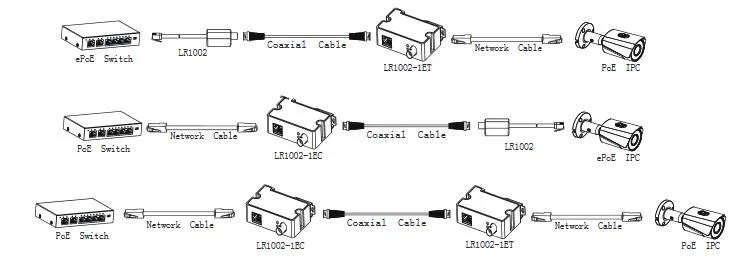 > Supports RG59 coaxial cable: 400m/100Mbps,1000m/10Mbps.