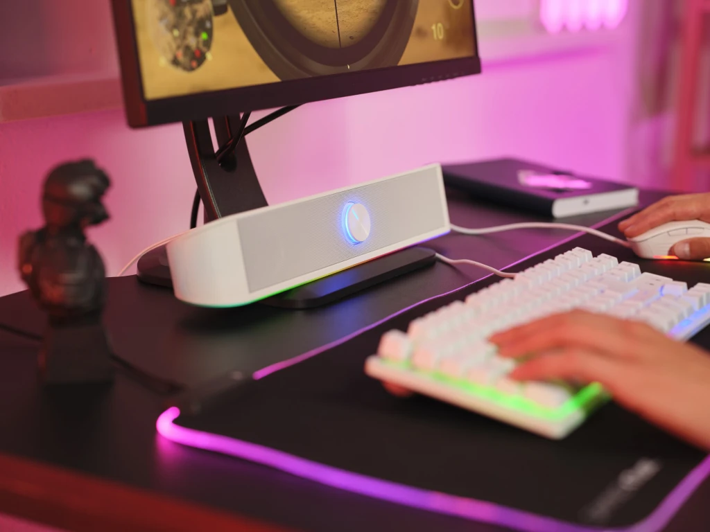 Trust GXT 619W Thorne. Audioväljundi kanalid: 2.0 kanalid, RMS-nimivõimsus: 6 W, Maksimaalne muusikaline väljundvõimsus (PMPO): 12 W. Soundbar-kõlari RMS-võimsus: 6 W, Näivtakistus: 10000 Ω, Piuksuja takistus: 4 Ω. Toote värv: Valge, Päritoluriik: Hiina. Ühenduvustehnoloogia: Juhtmega ühendatud. Laius: 400 mm, Sügavus: 75 mm, Kõrgus: 75 mm