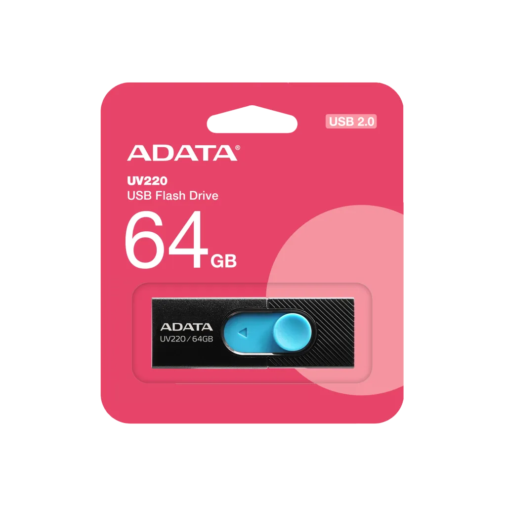 ADATA UV220. Maht: 64 GB, Seadme liides: USB tüüp A, USB versioon: 2.0. Toote kuju: Liugur. Kaal: 7,5 g. Toote värv: Must, Sinine