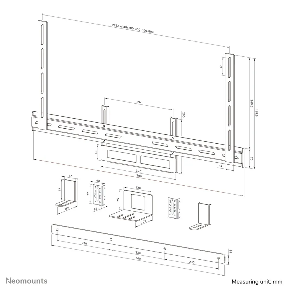 Neomounts AV2-500BL. Toote tüüp: Videobaari kinnitus, VESA-paigaldusliidesed: 200 x 200,200 x 300,200 x 400,400 x 200,400 x 300,400 x 400,400 x 500,400 x 600,600 x 200,600 x..., Ekraani minimaalne suurus: 109,2 cm (43"). Laius: 900 mm, Sügavus: 31 mm, Kõrgus: 416 mm. Pakendi laius: 220 mm, Pakendi sügavus: 84 mm, Pakendi kõrgus: 926 mm. Peamise pakendi netokaal: 21 kg, Tooteid kaubaaluse kohta (euroalus): 45 tk, Põhikasti (välimise) laius: 263 mm