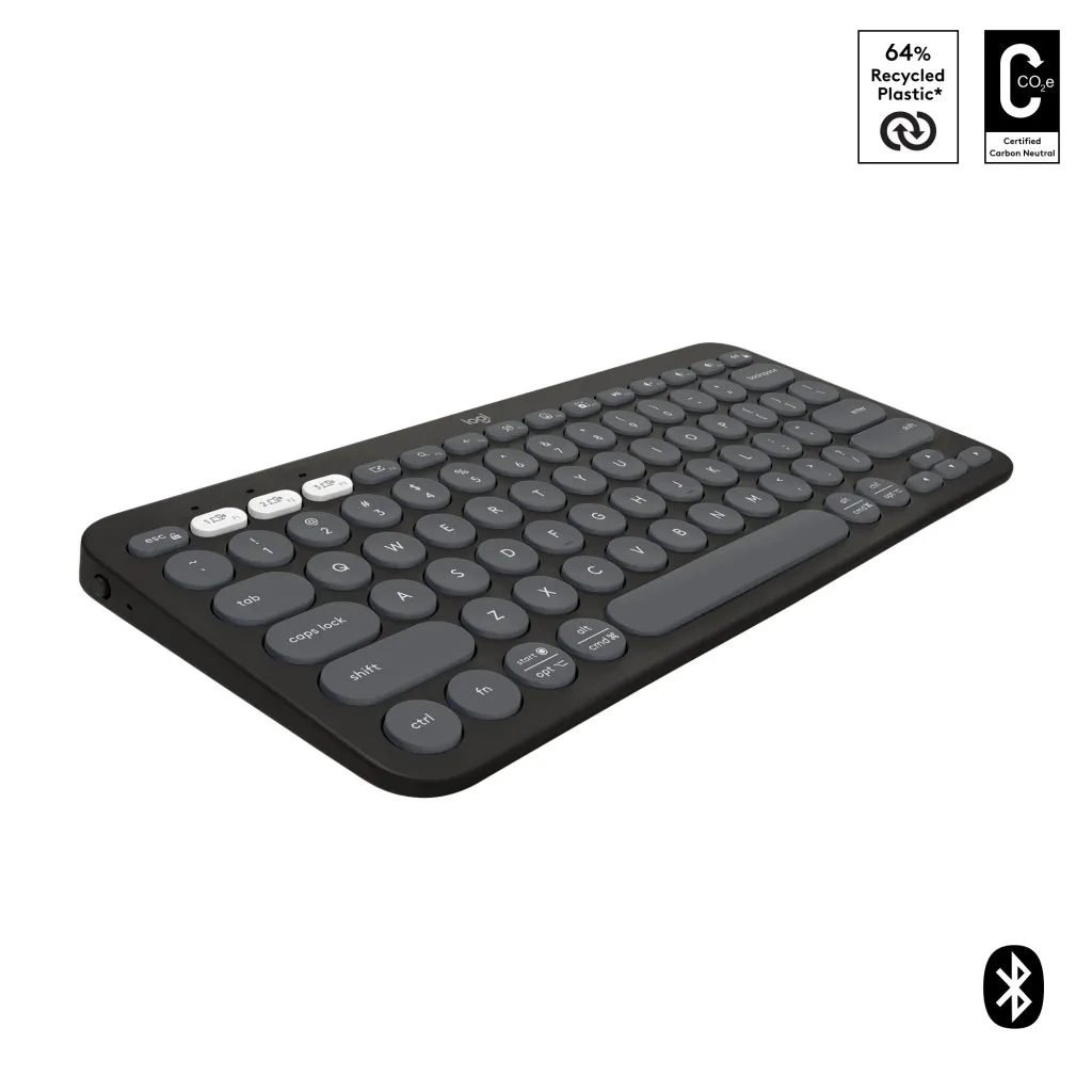 Logitech Pebble Keys 2 K380s. Klaviatuuri kujutegur: Mini. Klaviatuuri stiil: Sirge. Ühenduvustehnoloogia: Juhtmevaba, Seadme liides: RF juhtmeta ühendus + Bluetooth, Klaviatuuri klahvilüliti: Käärlüliti, Klaviatuuri paigutus: QWERTY, Soovituslik kasutus: Universaalne. Toote värv: Grafiit