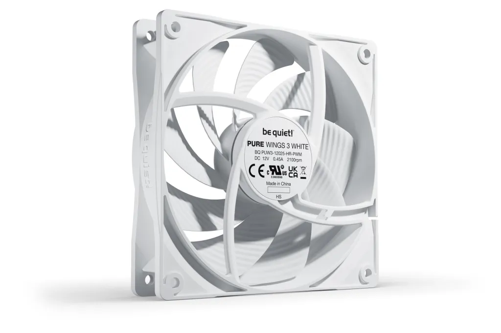 | Summary | be quiet! Pure Wings 3 120mm PWM high-speed White. Type: Fan, Fan diameter: 12 cm, Rotational speed (max): 2100 RPM, Airflow: 101.2 m³/h, Maximum air pressure: 2.41 mmH2O, Bearing type: Rifle bearing. Voltage: 5 - 13.2 V. Width: 120 mm, Depth: 120 mm, Height: 25 mm. Product colour: White |