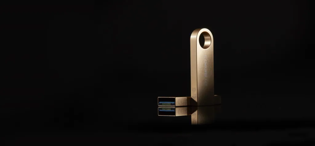 An all-metal gold casing that's portable enough to fit in your pocket, backpack or on your keyring loop.