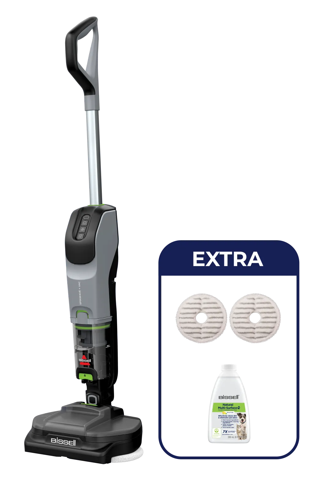 | Tarvikud kaasa arvatud | SpinWave® + Vac 2 sets of reusable scrubby pads; SpinWave® + Vac Filter; 236 Ml Natural MultiSurface Pet Floor Cleaning Solution; Charger; Storage/Clean-out Tray; Pictorial User Guide |