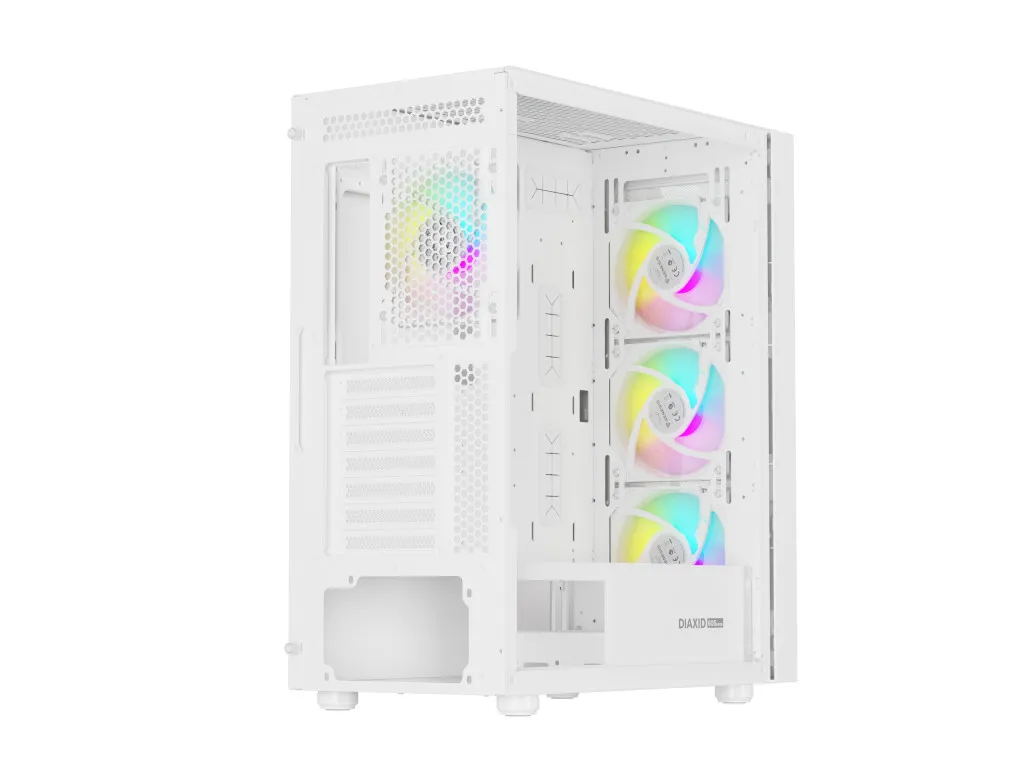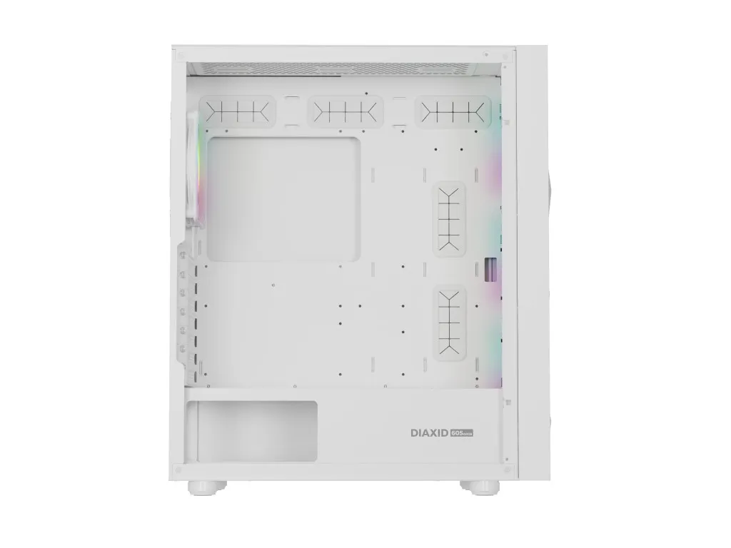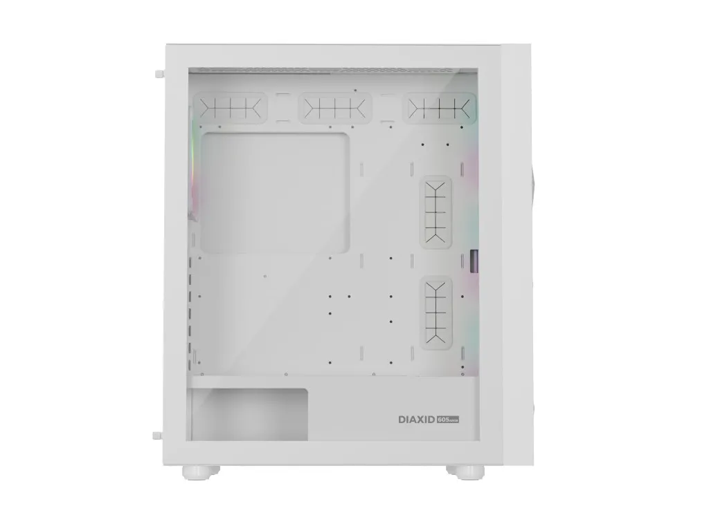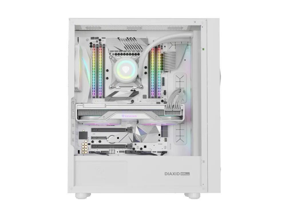 GENESIS Diaxid 605 ARGB. Toote kuju: Midi Tower, Tüüp: PC, Toote värv: Valge. Toiteploki asukoht: Põhi, Toetatud elektritoite tarne vormi faktorid: ATX. Installitud esiventilaatorid: 3x 120 mm, Toetatud esiventilaatorite läbimõõt: 120,140 mm, Installitud tagaventilaatorid: 1x 120 mm. Toetatud kõvakettasuurused: 2.5,3.5". Laius: 217 mm, Sügavus: 420 mm, Kõrgus: 466 mm